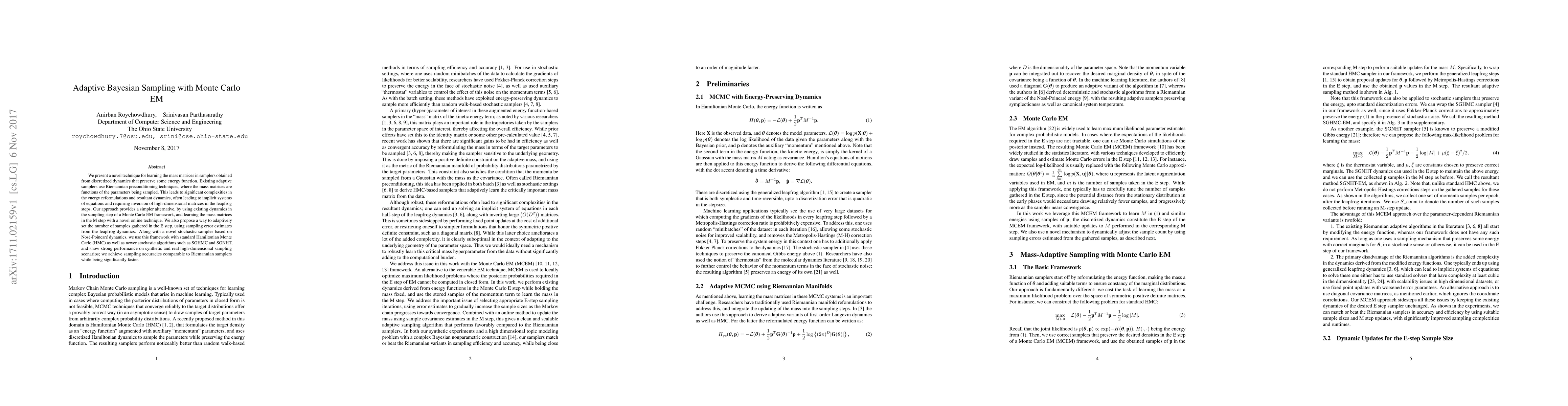 We present a novel technique for learning the mass matrices in samplers obtained from discretized dynamics that preserve some energy function. Existing adaptive samplers use Riemannian preconditioning techniques, where the mass matrices are functions of the parameters being sampled. This leads to significant complexities in the energy reformulations and resultant dynamics, often leading to implicit systems of equations and requiring inversion of high-dimensional matrices in the leapfrog steps. Our approach provides a simpler alternative, by using existing dynamics in the sampling step of a Monte Carlo EM framework, and learning the mass matrices in the M step with a novel online technique. We also propose a way to adaptively set the number of samples gathered in the E step, using sampling error estimates from the leapfrog dynamics. Along with a novel stochastic sampler based on Nos\'{e}-Poincar\'{e} dynamics, we use this framework with standard Hamiltonian Monte Carlo (HMC) as well as newer stochastic algorithms such as SGHMC and SGNHT, and show strong performance on synthetic and real high-dimensional sampling scenarios; we achieve sampling accuracies comparable to Riemannian samplers while being significantly faster.