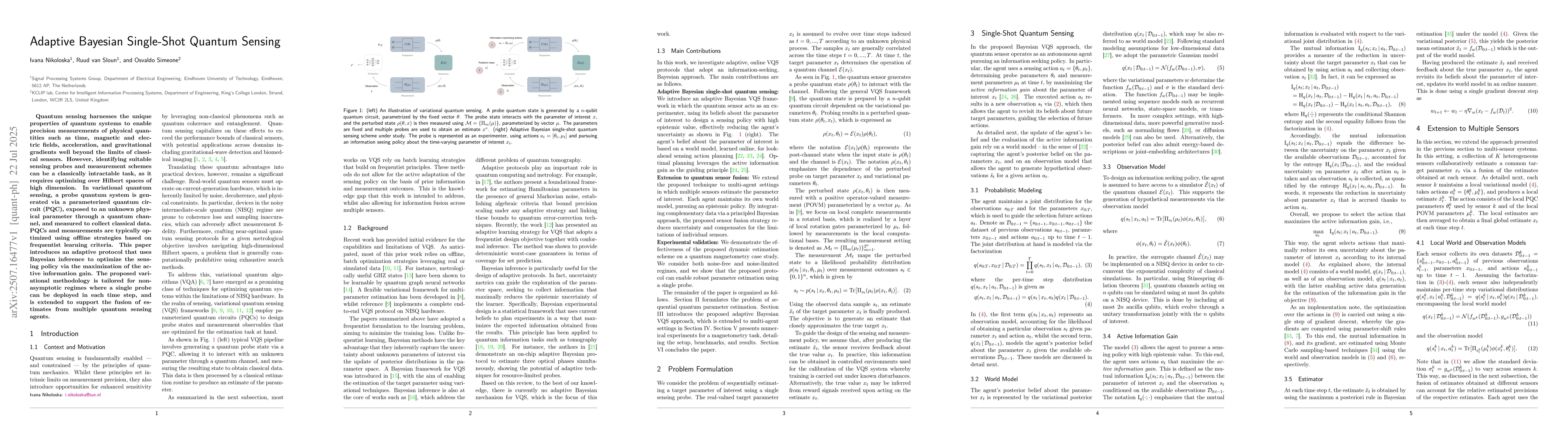Quantum sensing harnesses the unique properties of quantum systems to enable precision measurements of physical quantities such as time, magnetic and electric fields, acceleration, and gravitational gradients well beyond the limits of classical sensors. However, identifying suitable sensing probes and measurement schemes can be a classically intractable task, as it requires optimizing over Hilbert spaces of high dimension. In variational quantum sensing, a probe quantum system is generated via a parameterized quantum circuit (PQC), exposed to an unknown physical parameter through a quantum channel, and measured to collect classical data. PQCs and measurements are typically optimized using offline strategies based on frequentist learning criteria. This paper introduces an adaptive protocol that uses Bayesian inference to optimize the sensing policy via the maximization of the active information gain. The proposed variational methodology is tailored for non-asymptotic regimes where a single probe can be deployed in each time step, and is extended to support the fusion of estimates from multiple quantum sensing agents.