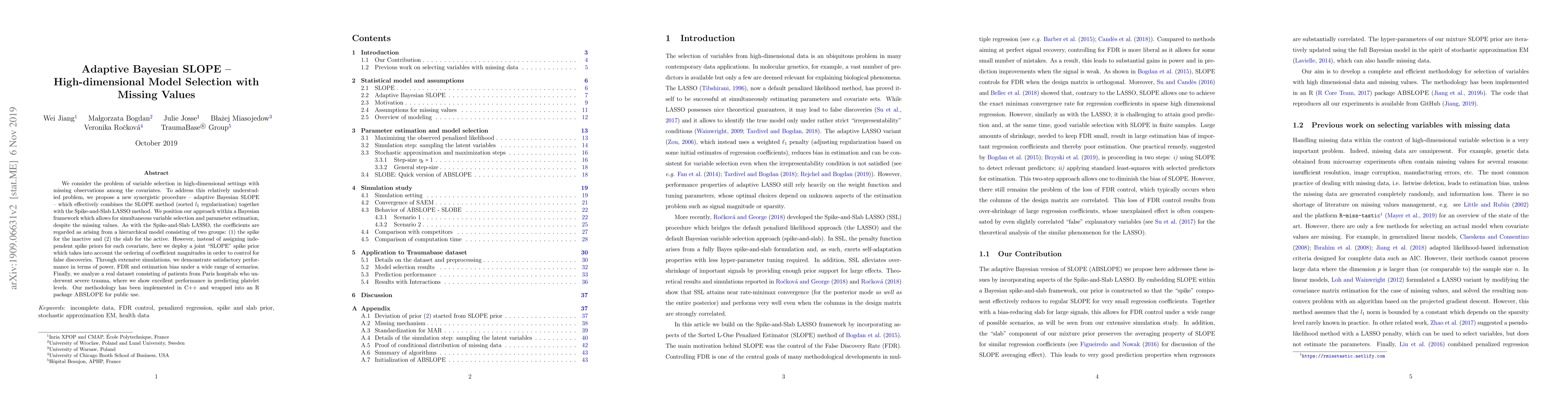 A new Bayesian method called adaptive Bayesian SLOPE is proposed for variable selection in high-dimensional settings with missing observations, showing satisfactory performance through simulations and a real-world application in predicting platelet levels.