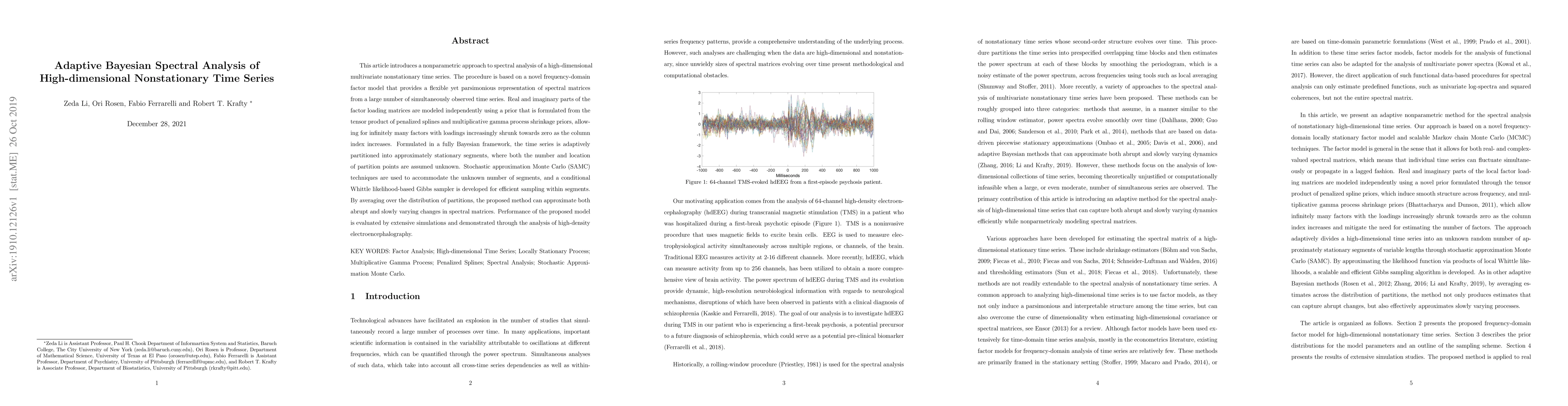 This paper proposes a Bayesian spectral analysis method for high-dimensional multivariate nonstationary time series using a flexible frequency-domain factor model. The method adaptively partitions the time series into stationary segments and employs stochastic approximation Monte Carlo and a Gibbs sampler for efficient sampling.