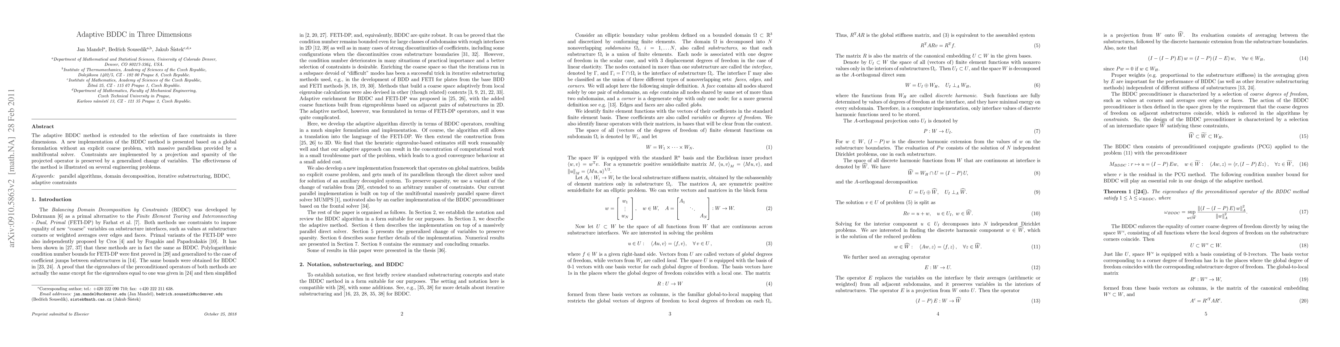 The paper presents an adaptive BDDC method for three-dimensional problems, utilizing a global formulation without a coarse problem and enhanced by a multifrontal solver for parallelism. The method maintains constraint sparsity through a generalized change of variables, demonstrating effectiveness in various engineering applications.