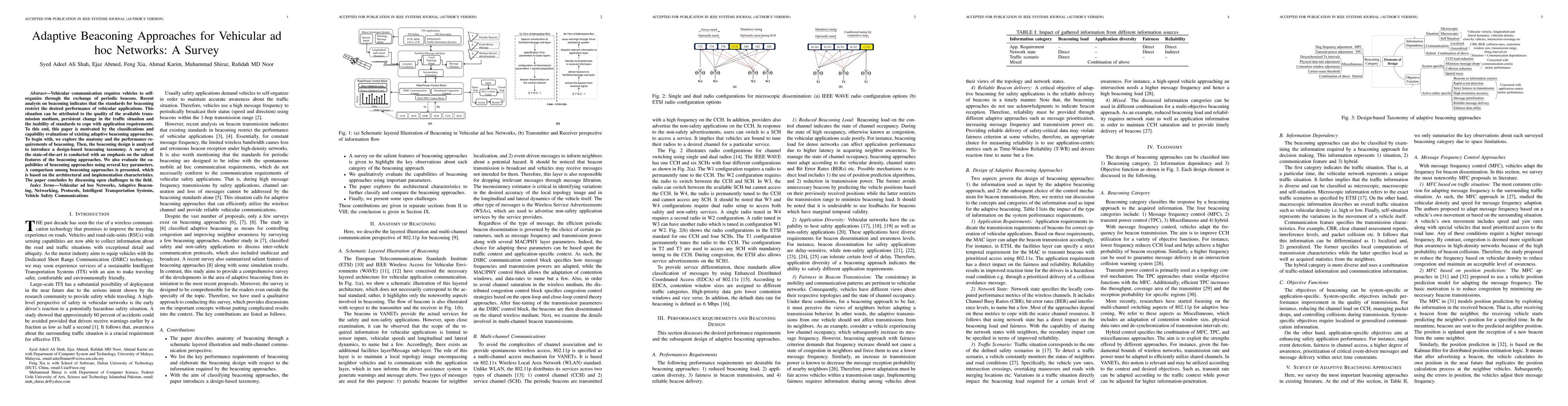 This paper surveys adaptive beaconing approaches for vehicular ad hoc networks, analyzing their design and performance. It evaluates existing methods based on key parameters and compares them according to architectural and implementation characteristics, concluding with open challenges in the field.
