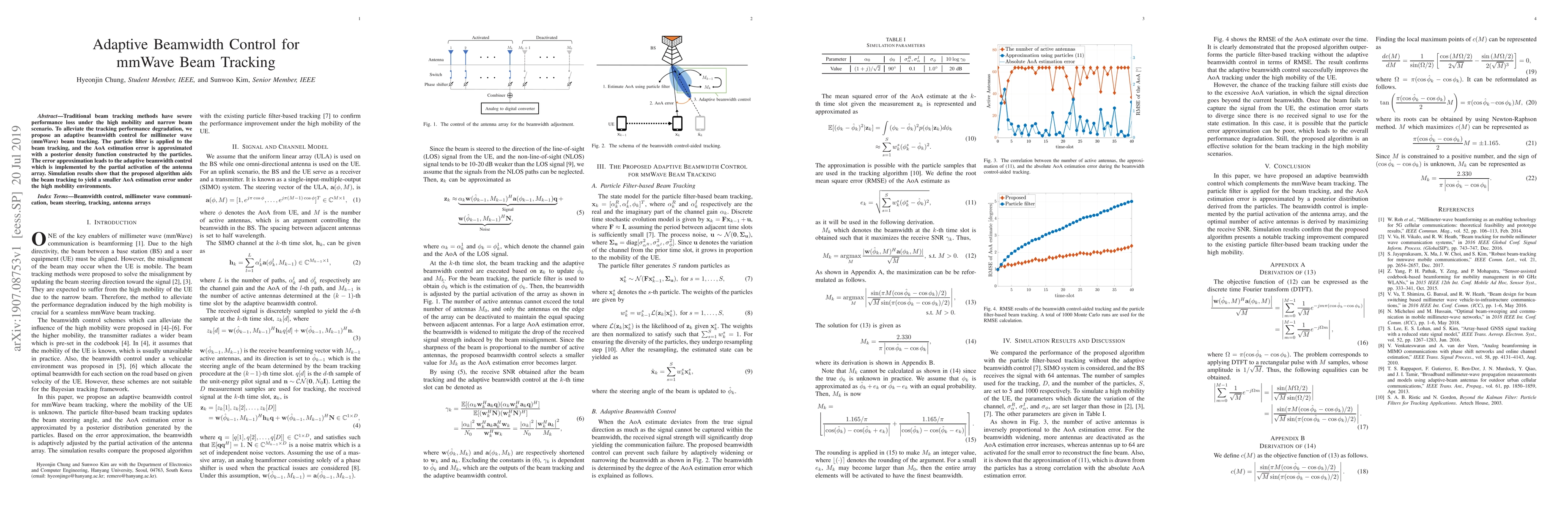 This paper proposes an adaptive beamwidth control method for mmWave beam tracking to improve performance under high mobility. Using a particle filter and posterior density function, the method dynamically adjusts the beamwidth via partial antenna array activation, resulting in reduced AoA estimation error in simulations.