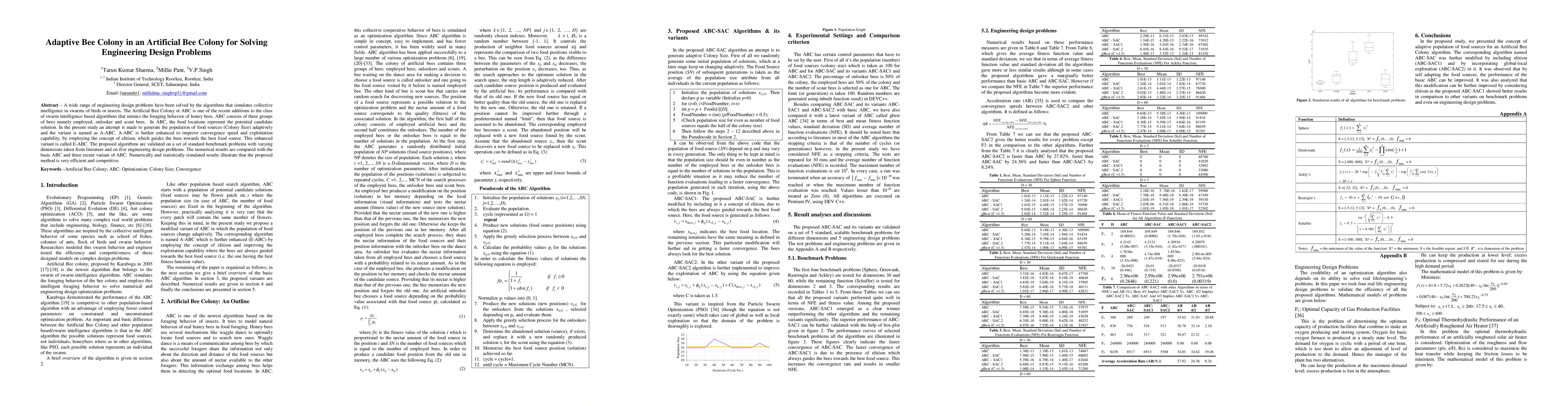 The research proposes an adaptive Artificial Bee Colony (ABC) algorithm, named ABC-SAC, which adaptively generates the population of food sources (colony size). This is further enhanced with elitism (ABC-SAC1) and global-local exploration (ABC-SAC2) to improve convergence speed and exploitation capability.