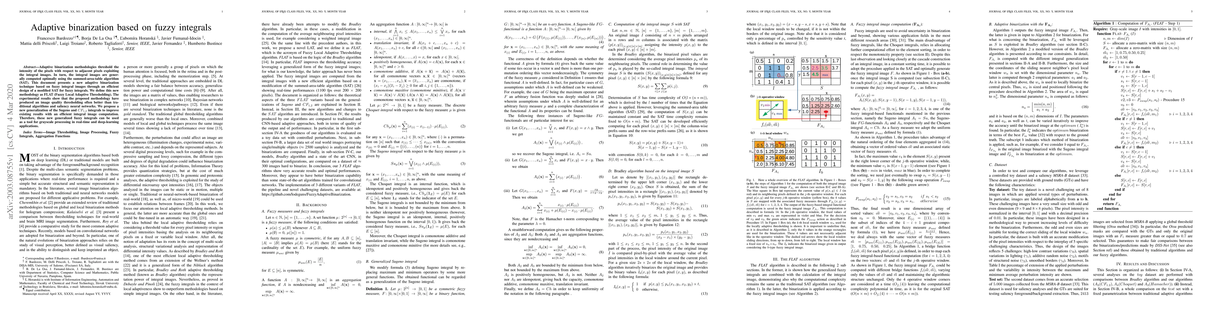 Adaptive binarization methodologies threshold the intensity of the pixels with respect to adjacent pixels exploiting the integral images. In turn, the integral images are generally computed optimally using the summed-area-table algorithm (SAT). This document presents a new adaptive binarization technique based on fuzzy integral images through an efficient design of a modified SAT for fuzzy integrals. We define this new methodology as FLAT (Fuzzy Local Adaptive Thresholding). The experimental results show that the proposed methodology have produced an image quality thresholding often better than traditional algorithms and saliency neural networks. We propose a new generalization of the Sugeno and CF 1,2 integrals to improve existing results with an efficient integral image computation. Therefore, these new generalized fuzzy integrals can be used as a tool for grayscale processing in real-time and deep-learning applications. Index Terms: Image Thresholding, Image Processing, Fuzzy Integrals, Aggregation Functions