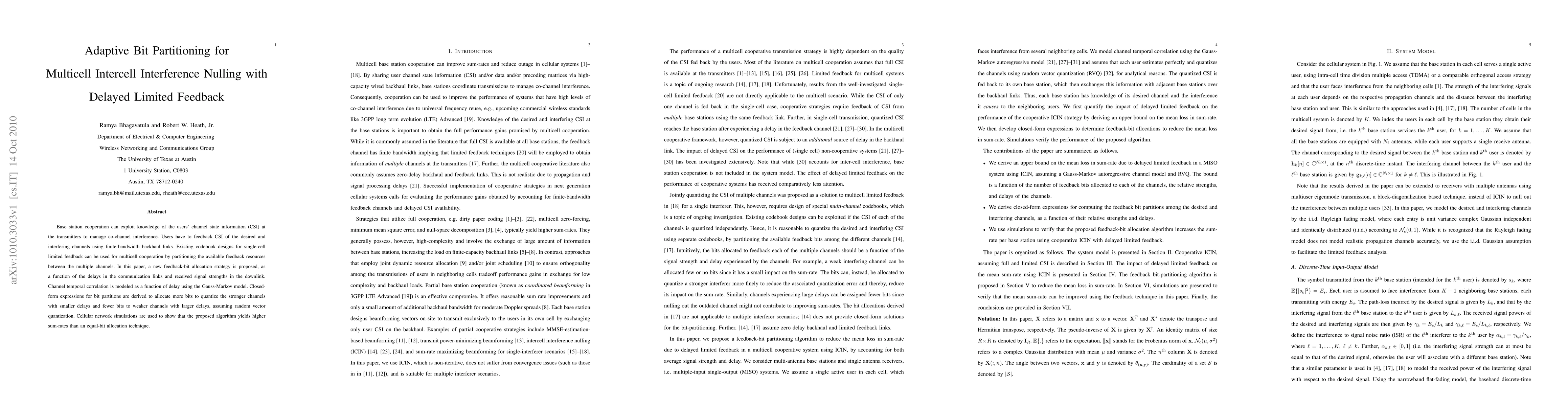 A new feedback-bit allocation strategy is proposed for adaptive bit partitioning in multicell interference nulling with delayed limited feedback, optimizing channel resources based on delay and signal strength.