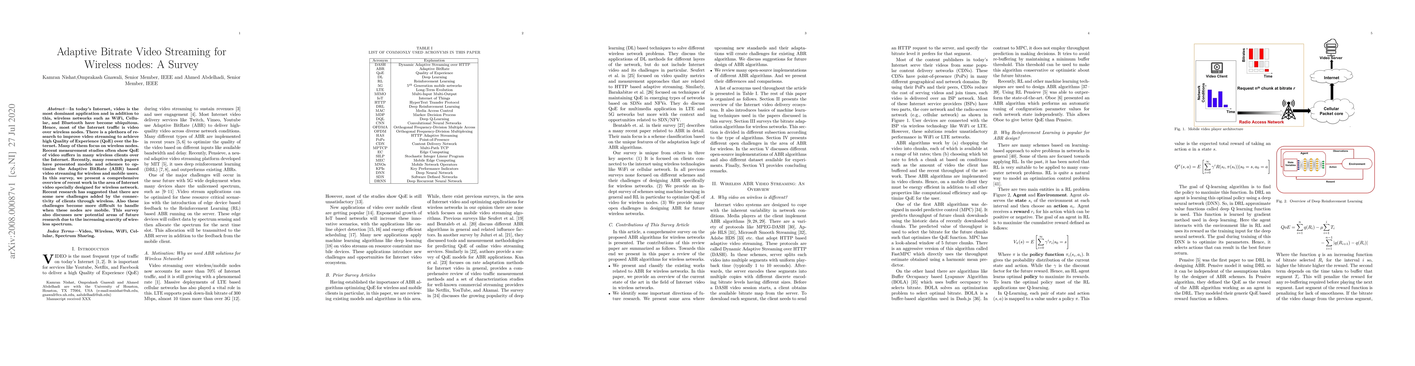 In today's Internet, video is the most dominant application and in addition to this, wireless networks such as WiFi, Cellular, and Bluetooth have become ubiquitous. Hence, most of the Internet traffic is video over wireless nodes. There is a plethora of research to improve video streaming to achieve high Quality of Experience (QoE) over the Internet. Many of them focus on wireless nodes. Recent measurement studies often show QoE of video suffers in many wireless clients over the Internet. Recently, many research papers have presented models and schemes to optimize the Adaptive BitRate (ABR) based video streaming for wireless and mobile users. In this survey, we present a comprehensive overview of recent work in the area of Internet video specially designed for wireless network. Recent research has suggested that there are some new challenges added by the connectivity of clients through wireless. Also these challenges become more difficult to handle when these nodes are mobile. This survey also discusses new potential areas of future research due to the increasing scarcity of wireless spectrum.