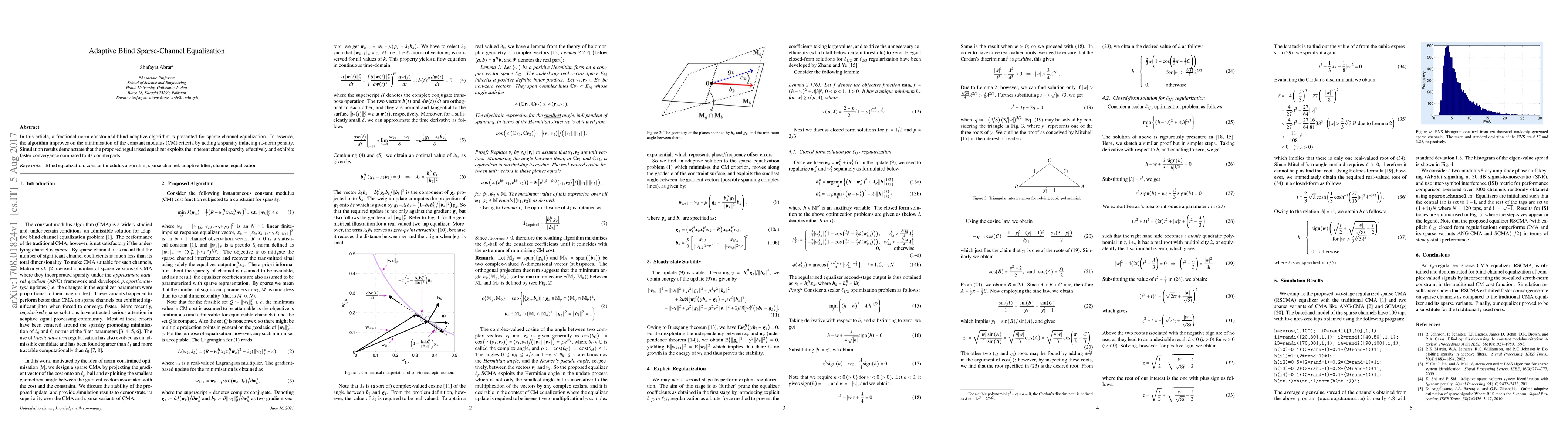 In this article, a fractional-norm constrained blind adaptive algorithm is presented for sparse channel equalization. In essence, the algorithm improves on the minimization of the constant modulus (CM) criteria by adding a sparsity inducing \(\ell_p\)-norm penalty. Simulation results demonstrate that the proposed regularized equalizer exploits the inherent channel sparsity effectively and exhibits faster convergence compared to its counterparts.
