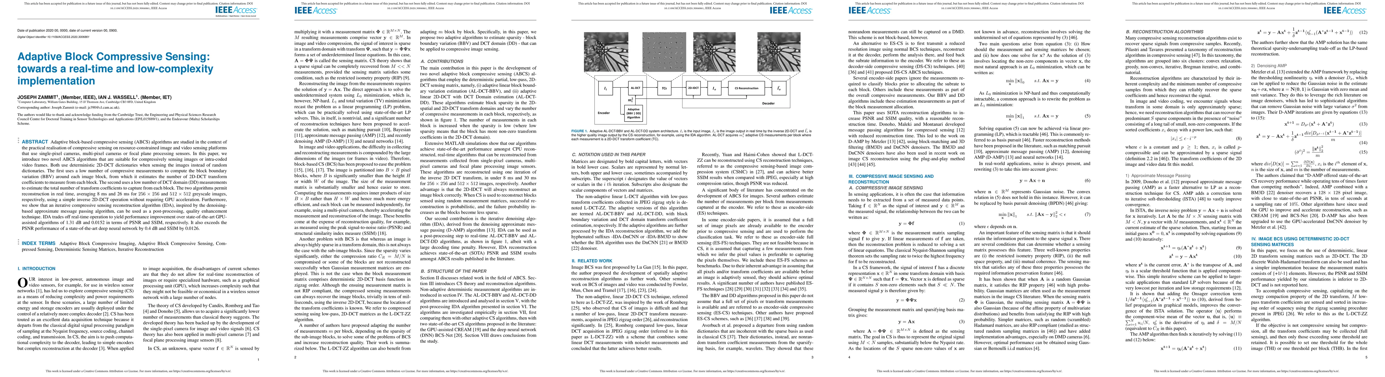 Adaptive block-based compressive sensing (ABCS) algorithms are studied in the context of the practical realization of compressive sensing on resource-constrained image and video sensing platforms that use single-pixel cameras, multi-pixel cameras or focal plane processing sensors. In this paper, we introduce two novel ABCS algorithms that are suitable for compressively sensing images or intra-coded video frames. Both use deterministic 2D-DCT dictionaries when sensing the images instead of random dictionaries. The first uses a low number of compressive measurements to compute the block boundary variation (BBV) around each image block, from which it estimates the number of 2D-DCT transform coefficients to measure from each block. The second uses a low number of DCT domain (DD) measurements to estimate the total number of transform coefficients to capture from each block. The two algorithms permit reconstruction in real time, averaging 8 ms and 26 ms for 256x256 and 512x512 greyscale images, respectively, using a simple inverse 2D-DCT operation without requiring GPU acceleration. Furthermore, we show that an iterative compressive sensing reconstruction algorithm (IDA), inspired by the denoising-based approximate message passing algorithm, can be used as a post-processing, quality enhancement technique. IDA trades off real-time operation to yield performance improvement over state-of-the-art GPU-assisted algorithms of 1.31 dB and 0.0152 in terms of PSNR and SSIM, respectively. It also exceeds the PSNR performance of a state-of-the-art deep neural network by 0.4 dB and SSIM by 0.0126.