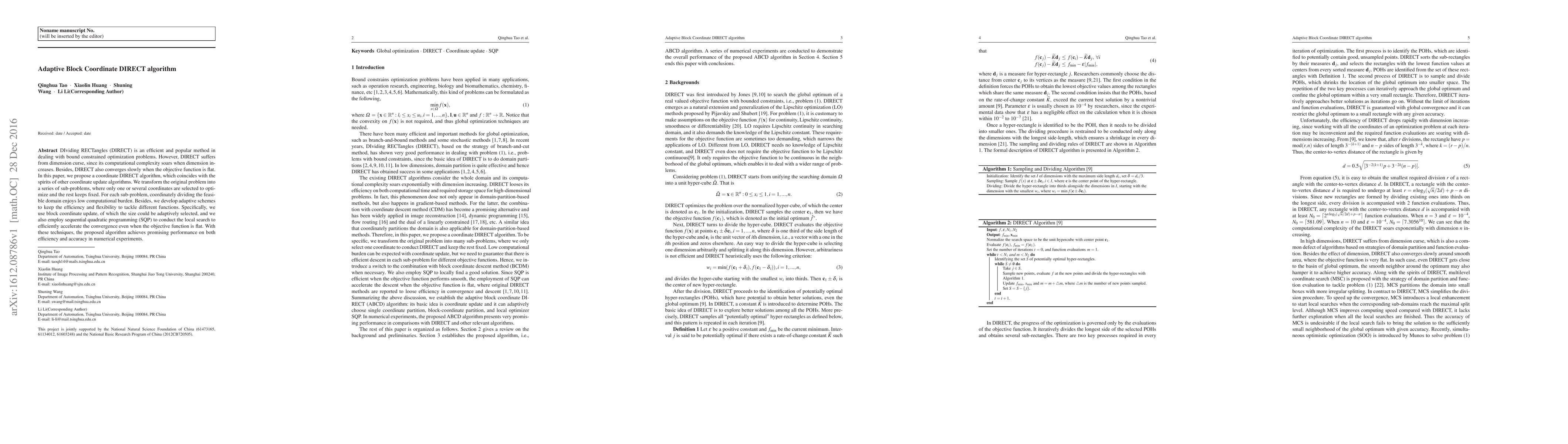 DIviding RECTangles (DIRECT) is an efficient and popular method in dealing with bound constrained optimization problems. However, DIRECT suffers from dimension curse, since its computational complexity soars when dimension increases. Besides, DIRECT also converges slowly when the objective function is flat. In this paper, we propose a coordinate DIRECT algorithm, which coincides with the spirits of other coordinate update algorithms. We transform the original problem into a series of sub-problems, where only one or several coordinates are selected to optimize and the rest keeps fixed. For each sub-problem, coordinately dividing the feasible domain enjoys low computational burden. Besides, we develop adaptive schemes to keep the efficiency and flexibility to tackle different functions. Specifically, we use block coordinate update, of which the size could be adaptively selected, and we also employ sequential quadratic programming (SQP) to conduct the local search to efficiently accelerate the convergence even when the objective function is flat. With these techniques, the proposed algorithm achieves promising performance on both efficiency and accuracy in numerical experiments.