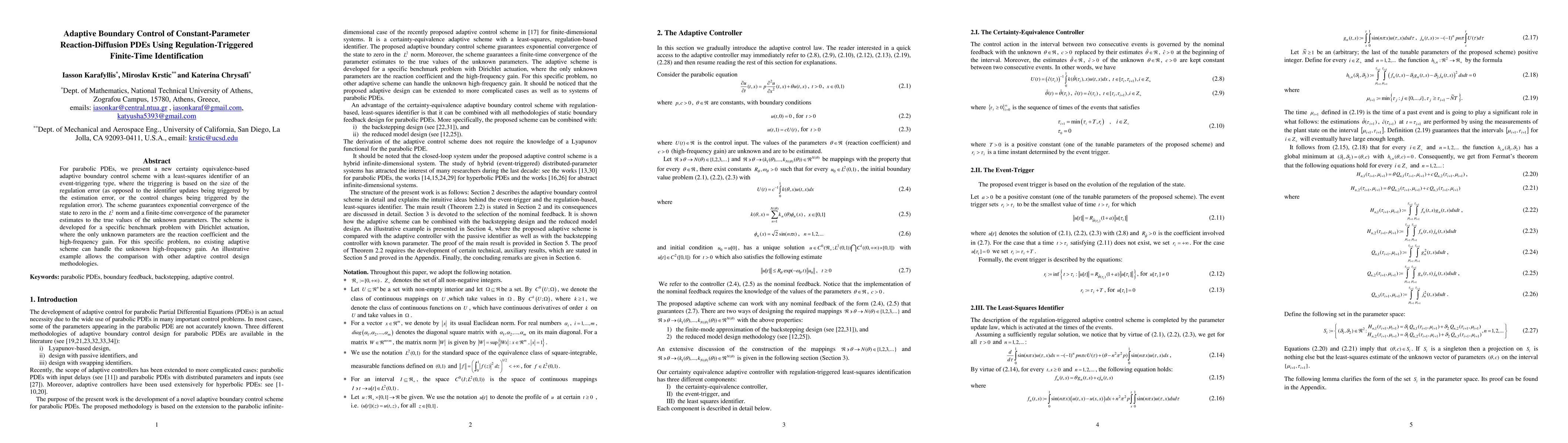 For parabolic PDEs, we present a new certainty equivalence-based adaptive boundary control scheme with a least-squares identifier of an event-triggering type, where the triggering is based on the size of the regulation error (as opposed to the identifier updates being triggered by the estimation error, or the control changes being triggered by the regulation error). The scheme guarantees exponential convergence of the state to zero in the L2 norm and a finite-time convergence of the parameter estimates to the true values of the unknown parameters. The scheme is developed for a specific benchmark problem with Dirichlet actuation, where the only unknown parameters are the reaction coefficient and the high-frequency gain. For this specific problem, no existing adaptive scheme can handle the unknown high-frequency gain. An illustrative example allows the comparison with other adaptive control design methodologies.
