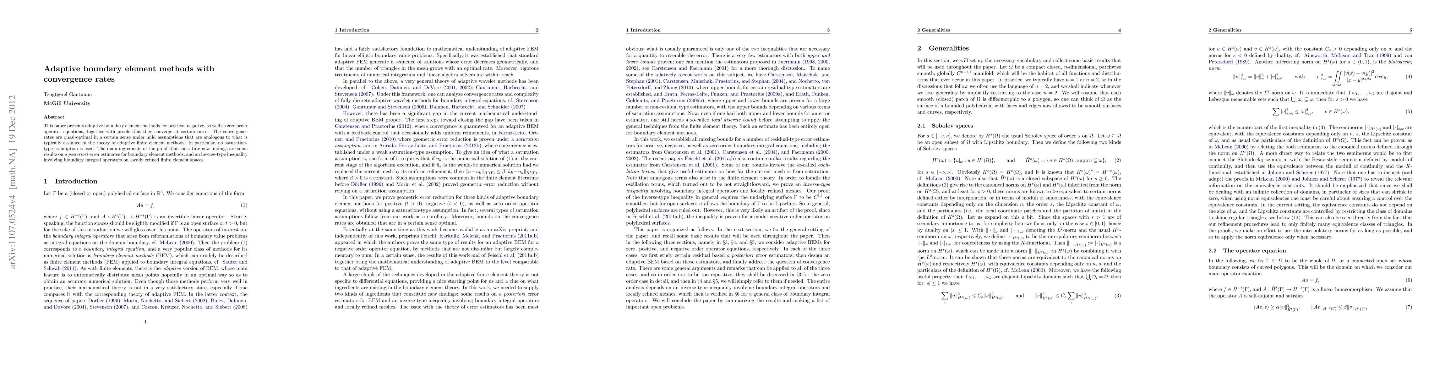 This paper introduces adaptive boundary element methods for various operator equations and proves their convergence at quasi-optimal rates, relying on new results on a posteriori error estimates and an inverse-type inequality for boundary integral operators.