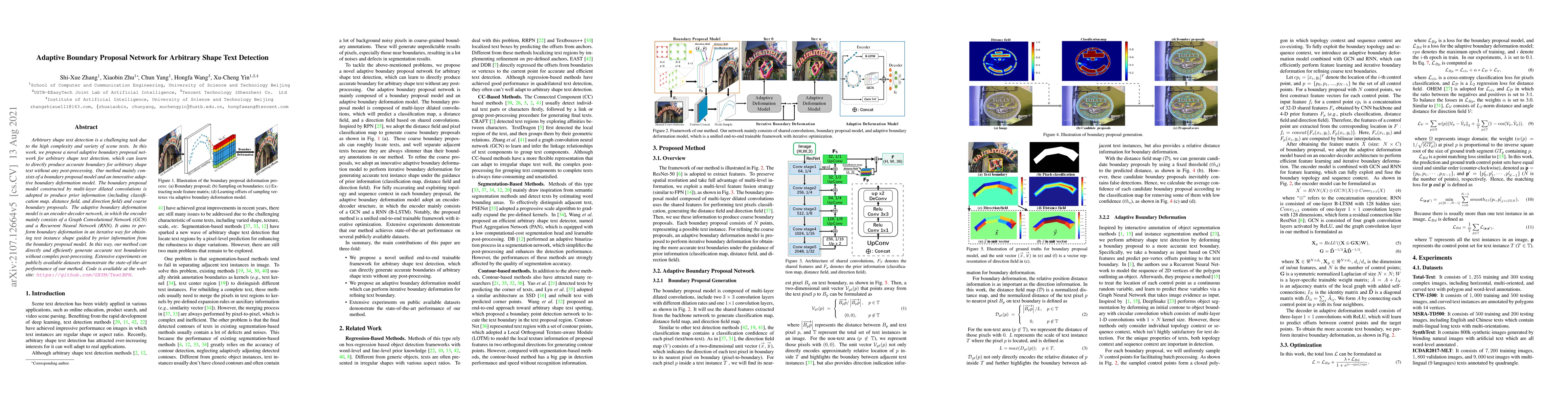 This paper proposes an adaptive boundary proposal network for detecting arbitrary shape text, featuring a boundary proposal model and an adaptive boundary deformation model to generate accurate text boundaries directly without post-processing, achieving state-of-the-art performance on public datasets.