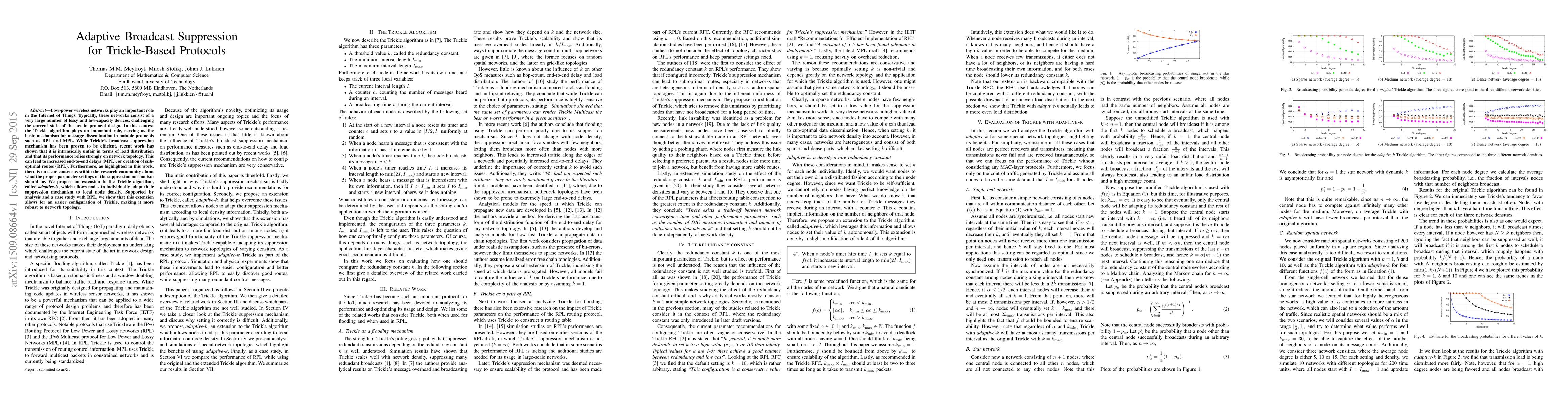 Researchers developed an adaptive broadcast suppression mechanism for Trickle-based protocols, allowing nodes to adjust their suppression based on local node density, improving network performance and load distribution.