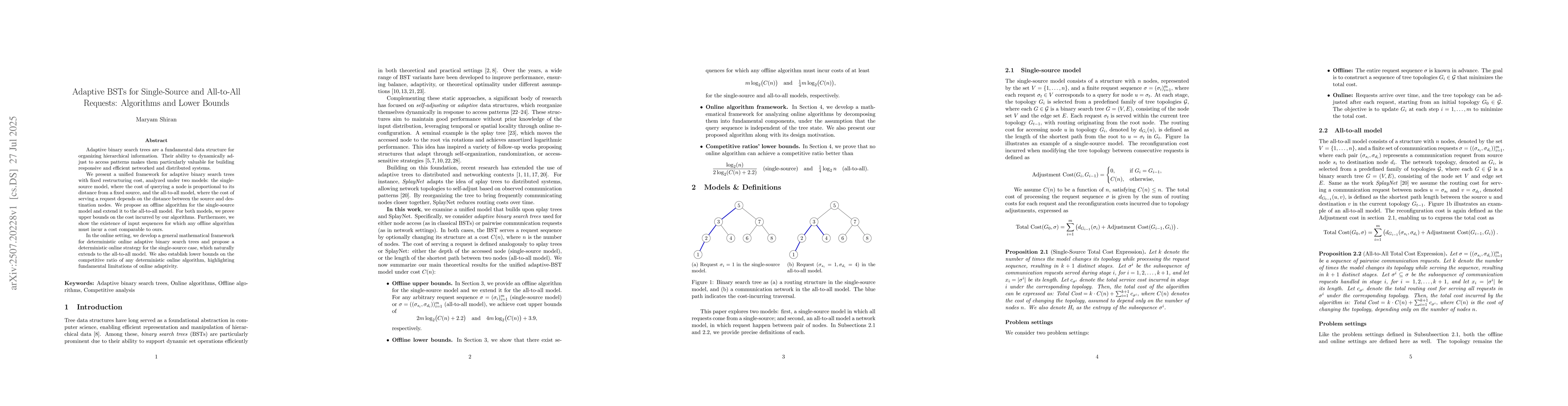 Adaptive binary search trees are a fundamental data structure for organizing hierarchical information. Their ability to dynamically adjust to access patterns makes them particularly valuable for building responsive and efficient networked and distributed systems. We present a unified framework for adaptive binary search trees with fixed restructuring cost, analyzed under two models: the single-source model, where the cost of querying a node is proportional to its distance from a fixed source, and the all-to-all model, where the cost of serving a request depends on the distance between the source and destination nodes. We propose an offline algorithm for the single-source model and extend it to the all-to-all model. For both models, we prove upper bounds on the cost incurred by our algorithms. Furthermore, we show the existence of input sequences for which any offline algorithm must incur a cost comparable to ours. In the online setting, we develop a general mathematical framework for deterministic online adaptive binary search trees and propose a deterministic online strategy for the single-source case, which naturally extends to the all-to-all model. We also establish lower bounds on the competitive ratio of any deterministic online algorithm, highlighting fundamental limitations of online adaptivity.