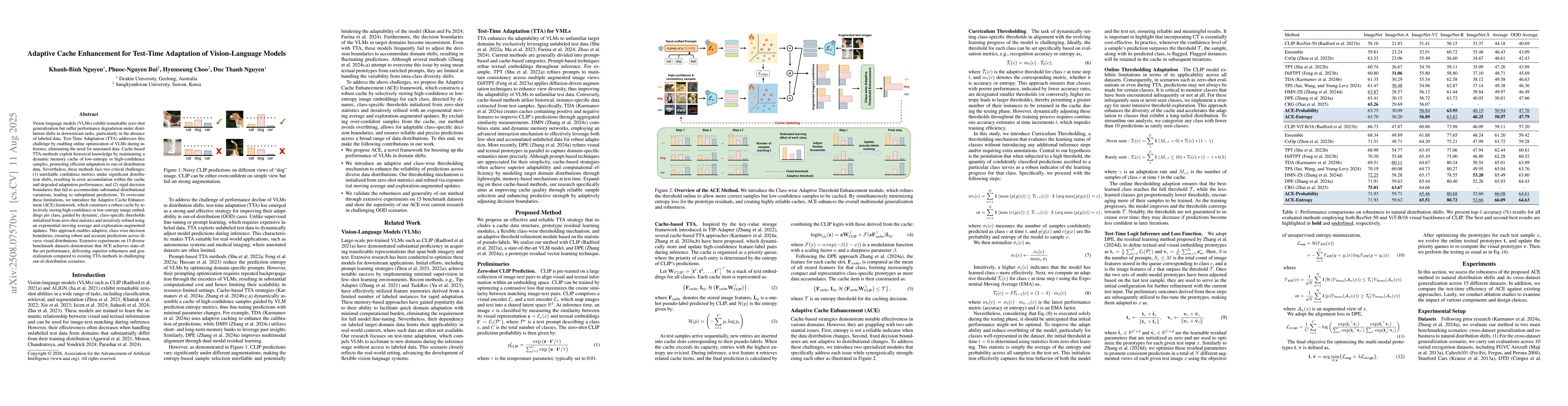 The paper introduces Adaptive Cache Enhancement (ACE), a framework for Test-Time Adaptation (TTA) of Vision-Language Models (VLMs). ACE constructs a robust cache by selectively storing high-confidence or low-entropy image embeddings per class, using dynamic, class-specific thresholds initialized from zero-shot statistics and refined iteratively.