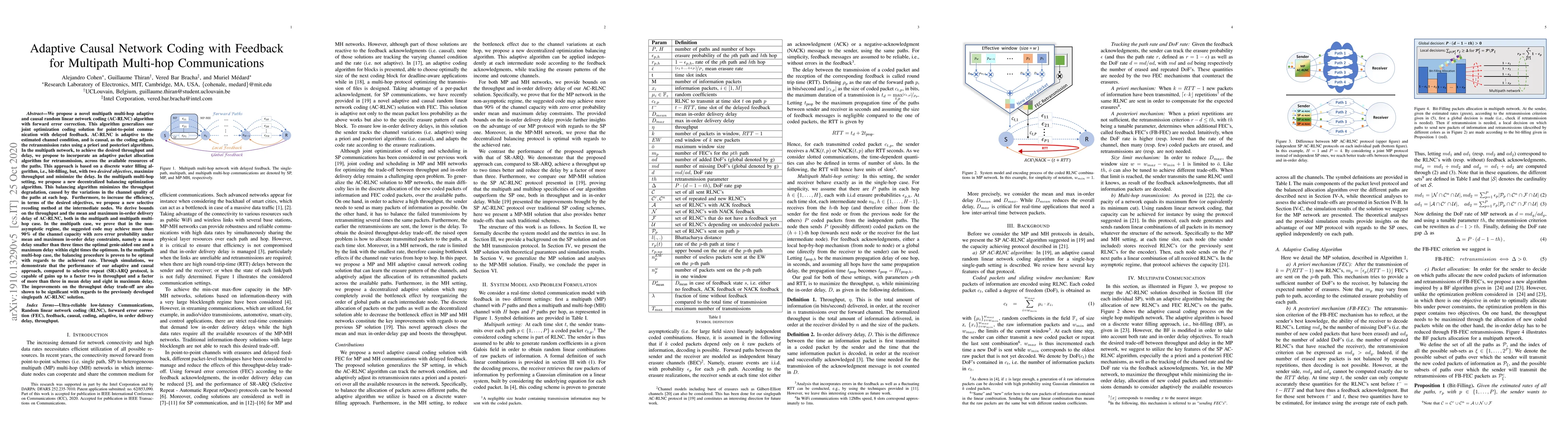 This paper proposes an adaptive causal random linear network coding (AC-RLNC) algorithm for multipath multi-hop communications, incorporating adaptive packet allocation and a decentralized balancing optimization algorithm to maximize throughput and minimize delay. Simulation results show significant performance gains over selective repeat ARQ protocol.