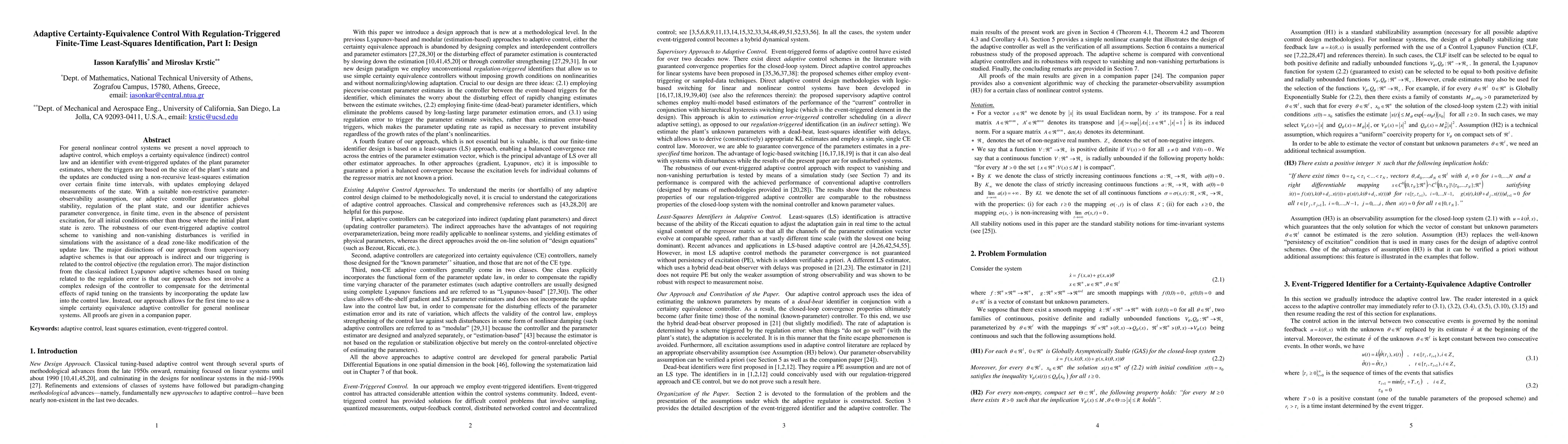 For general nonlinear control systems we present a novel approach to adaptive control, which employs a certainty equivalence (indirect) control law and an identifier with event-triggered updates of the plant parameter estimates, where the triggers are based on the size of the plant's state and the updates are conducted using a non-recursive least-squares estimation over certain finite time intervals, with updates employing delayed measurements of the state. With a suitable non-restrictive parameter-observability assumption, our adaptive controller guarantees global stability, regulation of the plant state, and our identifier achieves parameter convergence, in finite time, even in the absence of persistent excitation, for all initial conditions other than those where the initial plant state is zero. The robustness of our event-triggered adaptive control scheme to vanishing and non-vanishing disturbances is verified in simulations with the assistance of a dead zone-like modification of the update law. The major distinctions of our approach from supervisory adaptive schemes is that our approach is indirect and our triggering is related to the control objective (the regulation error). The major distinction from the classical indirect Lyapunov adaptive schemes based on tuning related to the regulation error is that our approach does not involve a complex redesign of the controller to compensate for the detrimental effects of rapid tuning on the transients by incorporating the update law into the control law. Instead, our approach allows for the first time to use a simple certainty equivalence adaptive controller for general nonlinear systems. All proofs are given in a companion paper.