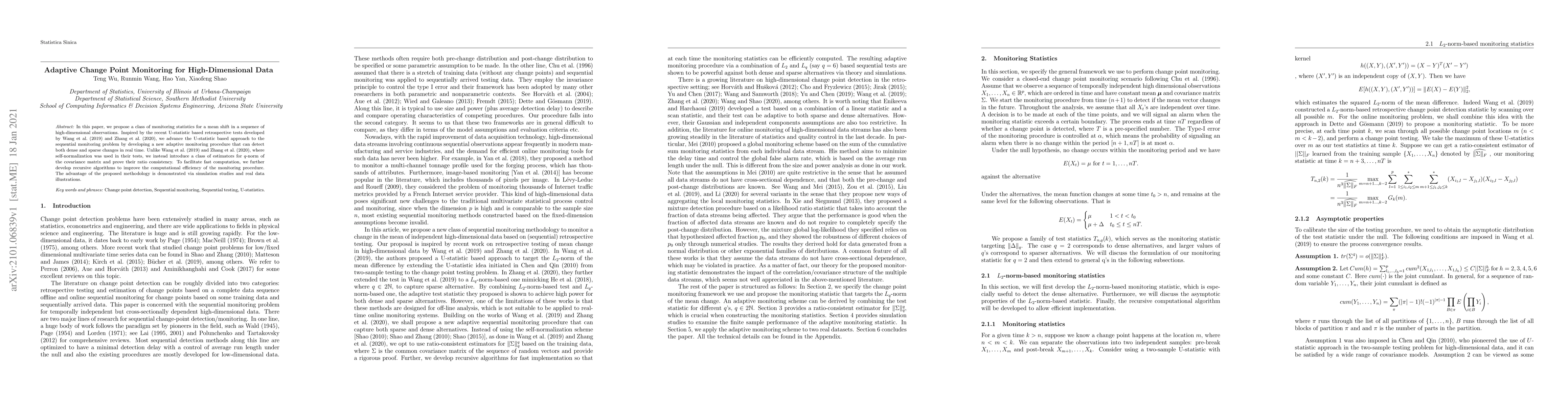 This paper introduces a new adaptive monitoring procedure for detecting mean shifts in high-dimensional data sequences, advancing U-statistic based methods to real-time applications. It employs $q$-norm covariance matrix estimators and recursive algorithms for computational efficiency, demonstrated through simulations and real data.