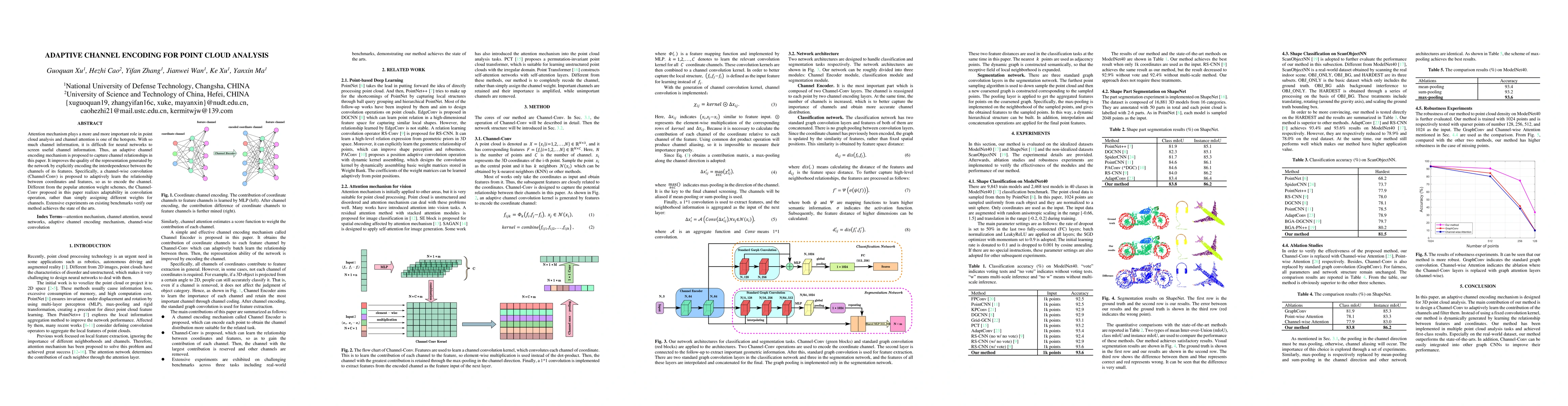 This paper proposes an adaptive channel encoding mechanism using channel-wise convolution to capture channel relationships in point cloud analysis, improving feature representation quality by encoding channel interdependence. Unlike traditional attention weight schemes, it achieves adaptability through convolution operations, leading to state-of-the-art performance on benchmarks.
