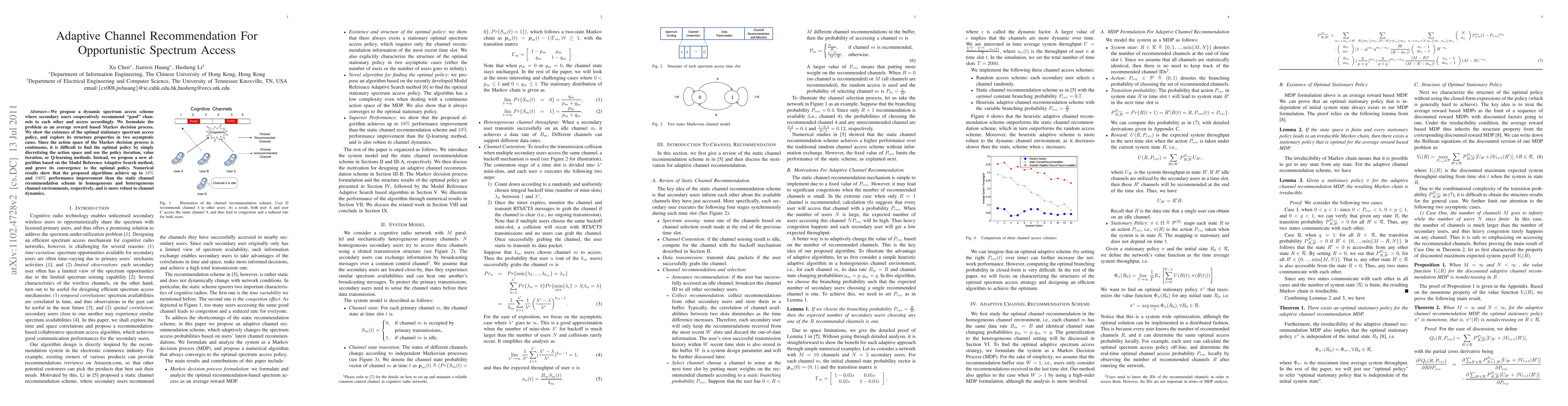 We propose a dynamic spectrum access scheme where secondary users recommend "good" channels to each other and access accordingly. We formulate the problem as an average reward based Markov decision process. We show the existence of the optimal stationary spectrum access policy, and explore its structure properties in two asymptotic cases. Since the action space of the Markov decision process is continuous, it is difficult to find the optimal policy by simply discretizing the action space and use the policy iteration, value iteration, or Q-learning methods. Instead, we propose a new algorithm based on the Model Reference Adaptive Search method, and prove its convergence to the optimal policy. Numerical results show that the proposed algorithms achieve up to 18% and 100% performance improvement than the static channel recommendation scheme in homogeneous and heterogeneous channel environments, respectively, and is more robust to channel dynamics.