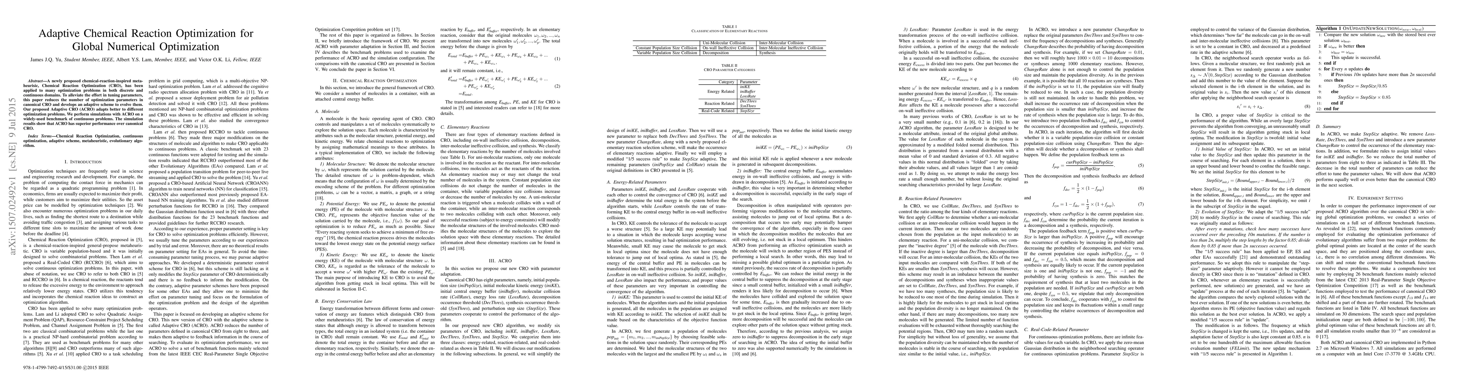 This paper proposes Adaptive Chemical Reaction Optimization (ACRO) to improve the performance of the canonical CRO method by reducing its parameters and incorporating an adaptive scheme. Simulation results demonstrate that ACRO outperforms canonical CRO on a benchmark of continuous optimization problems.