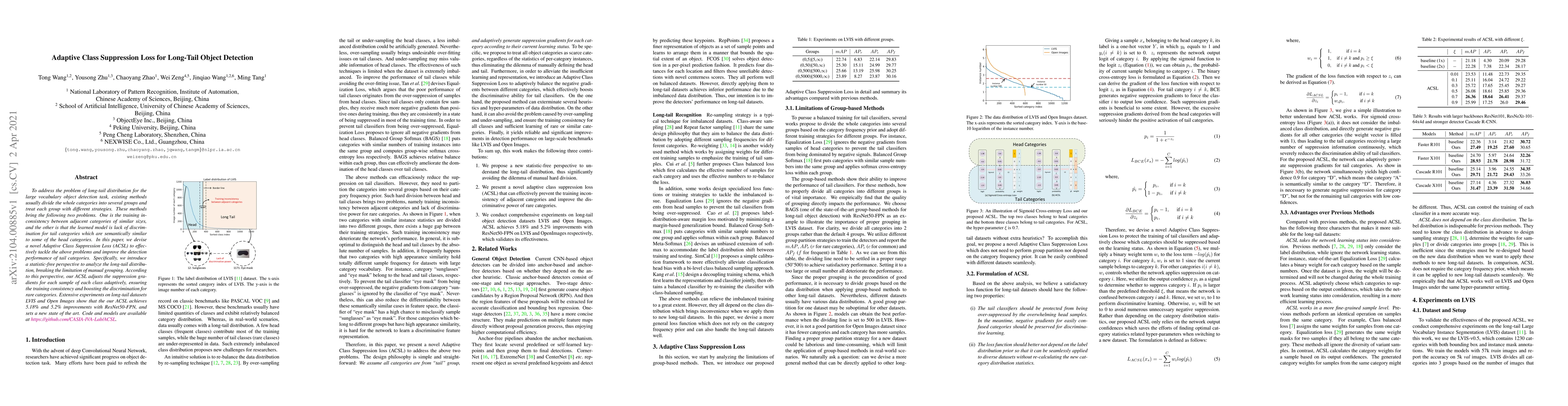 This paper proposes an Adaptive Class Suppression Loss (ACSL) to address long-tail distribution issues in large vocabulary object detection, improving detection performance for tail categories by adaptively adjusting suppression gradients without manual grouping. Experiments show ACSL achieves significant improvements on LVIS and Open Images datasets, setting a new state of the art.