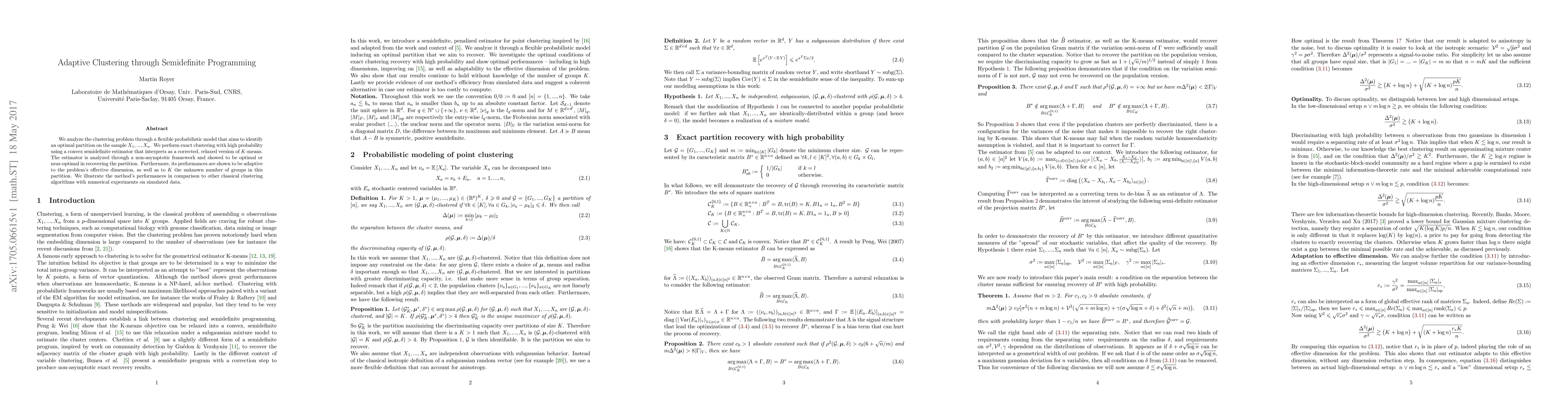 We analyze the clustering problem through a flexible probabilistic model that aims to identify an optimal partition on the sample X 1 , ..., X n. We perform exact clustering with high probability using a convex semidefinite estimator that interprets as a corrected, relaxed version of K-means. The estimator is analyzed through a non-asymptotic framework and showed to be optimal or near-optimal in recovering the partition. Furthermore, its performances are shown to be adaptive to the problem's effective dimension, as well as to K the unknown number of groups in this partition. We illustrate the method's performances in comparison to other classical clustering algorithms with numerical experiments on simulated data.