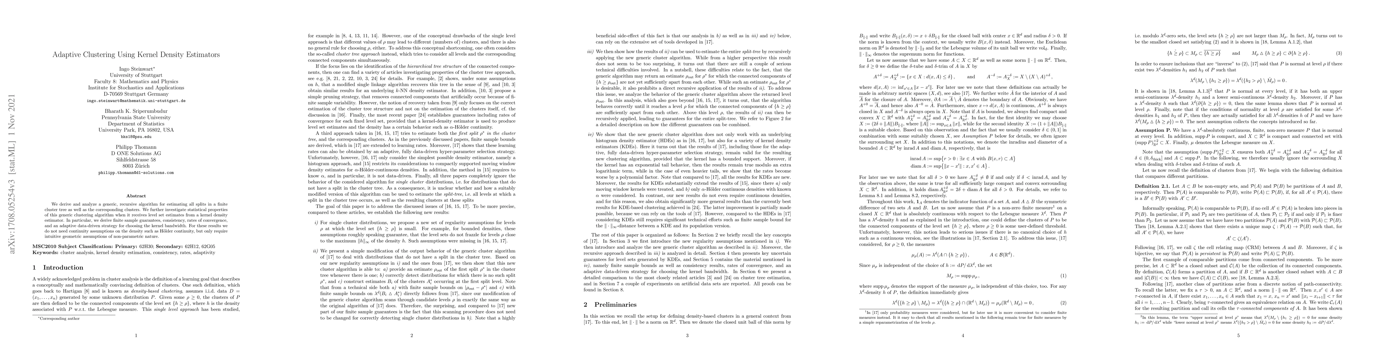 This paper proposes a recursive algorithm for adaptive clustering using kernel density estimators, providing statistical properties including consistency and convergence rates. It introduces an adaptive method for selecting kernel bandwidth without requiring strict continuity assumptions, relying instead on geometric non-parametric conditions.