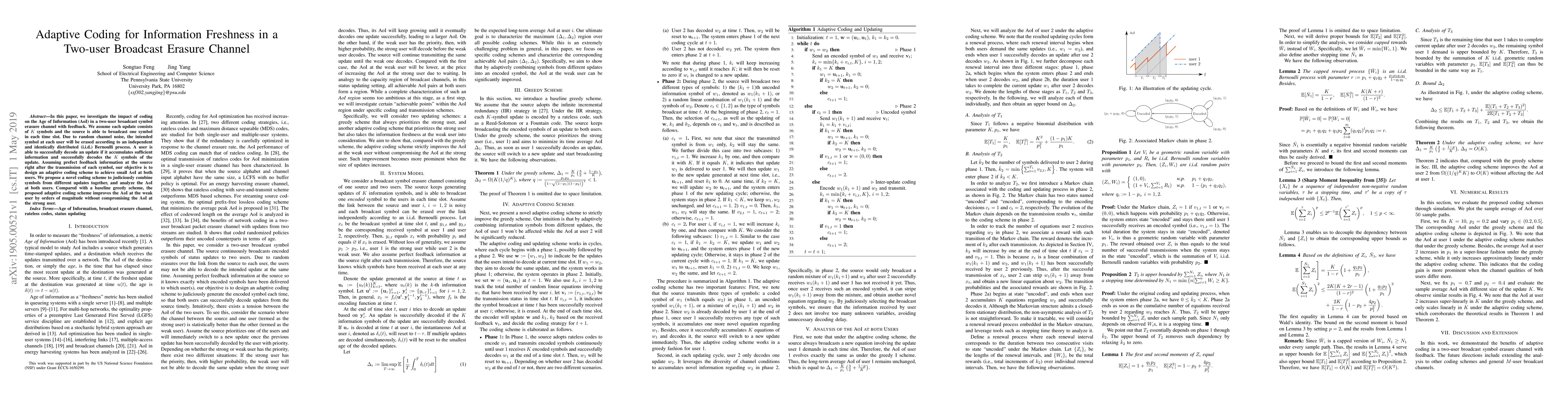 This paper proposes an adaptive coding scheme to minimize the Age of Information (AoI) in a two-user broadcast erasure channel, achieving significant improvements for the weaker user without affecting the stronger user. The scheme combines symbols from different updates to enhance decoding efficiency, outperforming a baseline greedy approach.