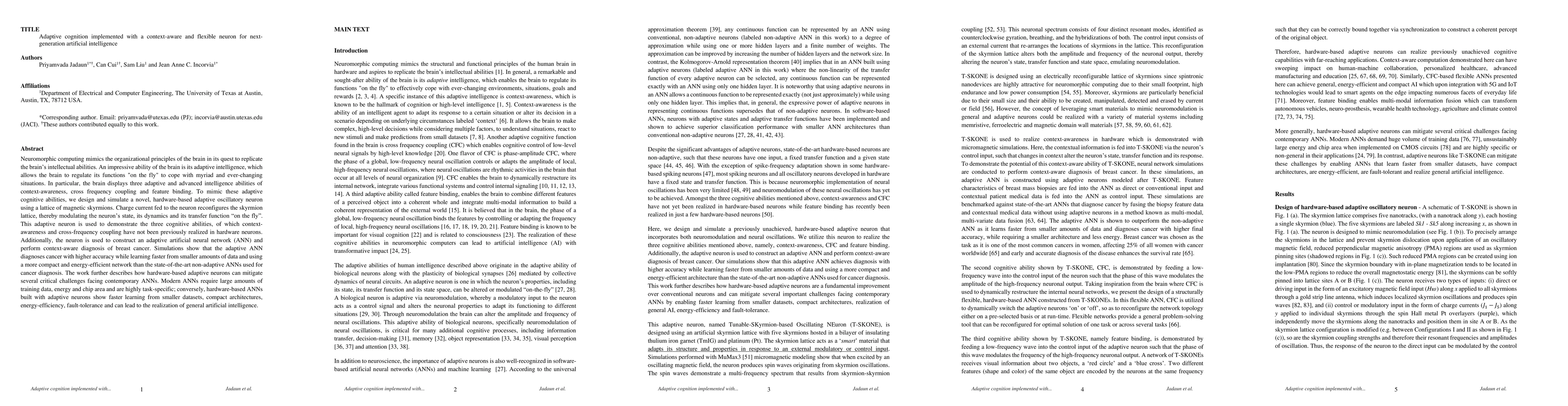 This paper introduces a novel adaptive oscillatory neuron based on magnetic skyrmions to mimic the brain's adaptive intelligence, demonstrating context-awareness, cross-frequency coupling, and feature binding. The adaptive neuron enables an artificial neural network to perform context-aware breast cancer diagnosis with higher accuracy, faster learning, and greater energy efficiency compared to traditional non-adaptive networks.