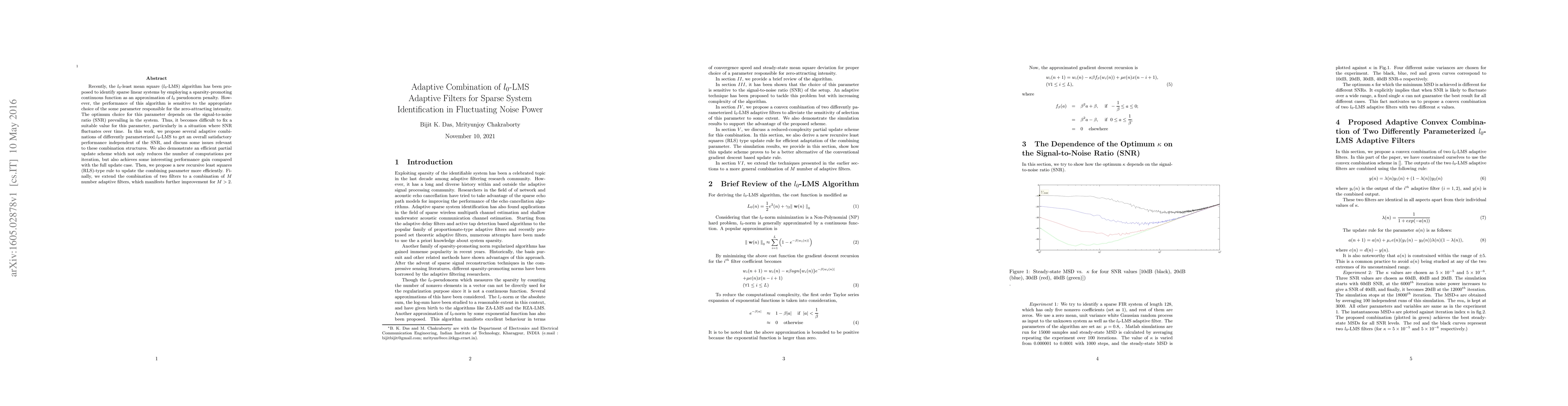 This paper proposes adaptive combinations of differently parameterized l0-LMS filters to identify sparse systems under fluctuating noise power. The authors introduce a new recursive least squares (RLS)-type rule to update the combining parameter, demonstrating improved performance and reduced computational load compared to full update schemes.