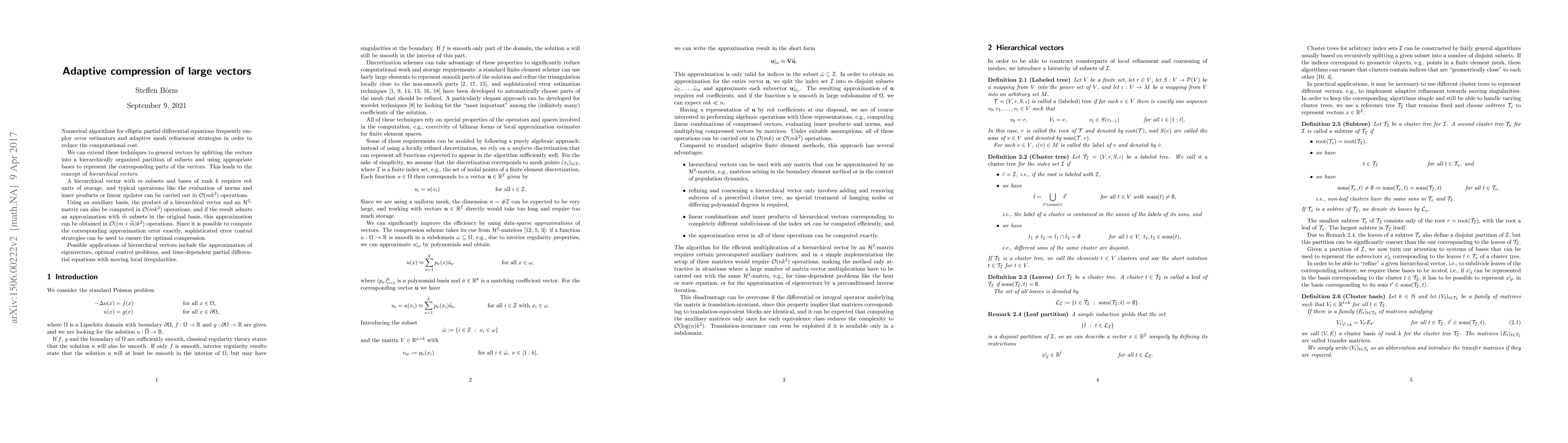 Numerical algorithms for elliptic partial differential equations frequently employ error estimators and adaptive mesh refinement strategies in order to reduce the computational cost. We can extend these techniques to general vectors by splitting the vectors into a hierarchically organized partition of subsets and using appropriate bases to represent the corresponding parts of the vectors. This leads to the concept of \emph{hierarchical vectors}. A hierarchical vector with $m$ subsets and bases of rank $k$ requires $mk$ units of storage, and typical operations like the evaluation of norms and inner products or linear updates can be carried out in $\mathcal{O}(mk^2)$ operations. Using an auxiliary basis, the product of a hierarchical vector and an $\mathcal{H}^2$-matrix can also be computed in $\mathcal{O}(mk^2)$ operations, and if the result admits an approximation with $\widetilde m$ subsets in the original basis, this approximation can be obtained in $\mathcal{O}((m+\widetilde m)k^2)$ operations. Since it is possible to compute the corresponding approximation error exactly, sophisticated error control strategies can be used to ensure the optimal compression. Possible applications of hierarchical vectors include the approximation of eigenvectors and the solution of time-dependent problems with moving local irregularities.