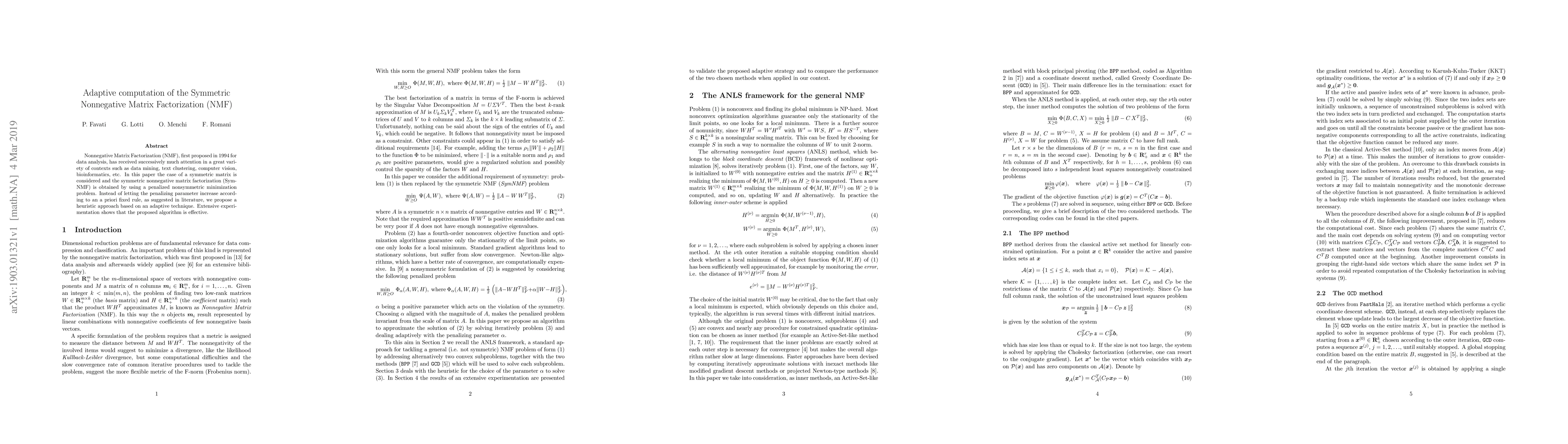 Nonnegative Matrix Factorization (NMF), first proposed in 1994 for data analysis, has received successively much attention in a great variety of contexts such as data mining, text clustering, computer vision, bioinformatics, etc. In this paper the case of a symmetric matrix is considered and the symmetric nonnegative matrix factorization (SymNMF) is obtained by using a penalized nonsymmetric minimization problem. Instead of letting the penalizing parameter increase according to an a priori fixed rule, as suggested in literature, we propose a heuristic approach based on an adaptive technique. Extensive experimentation shows that the proposed algorithm is effective.