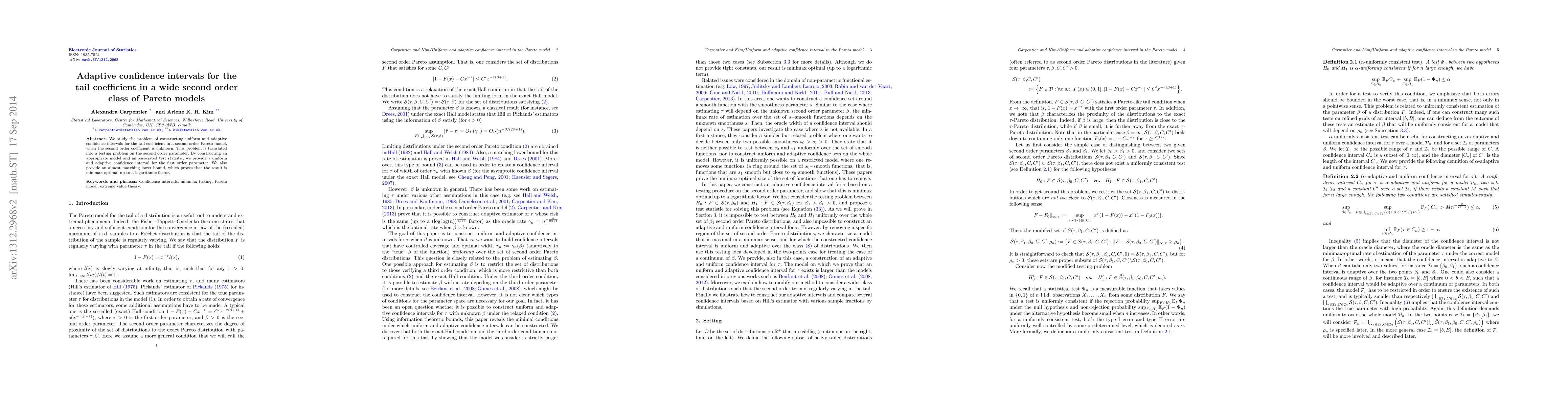 We study the problem of constructing honest and adaptive confidence intervals for the tail coefficient in the second order Pareto model, when the second order coefficient is unknown. This problem is translated into a testing problem on the second order parameter. By constructing an appropriate model and an associated test statistic, we provide a uniform and adaptive confidence interval for the first order parameter. We also provide an almost matching lower bound, which proves that the result is minimax optimal up to a logarithmic factor.