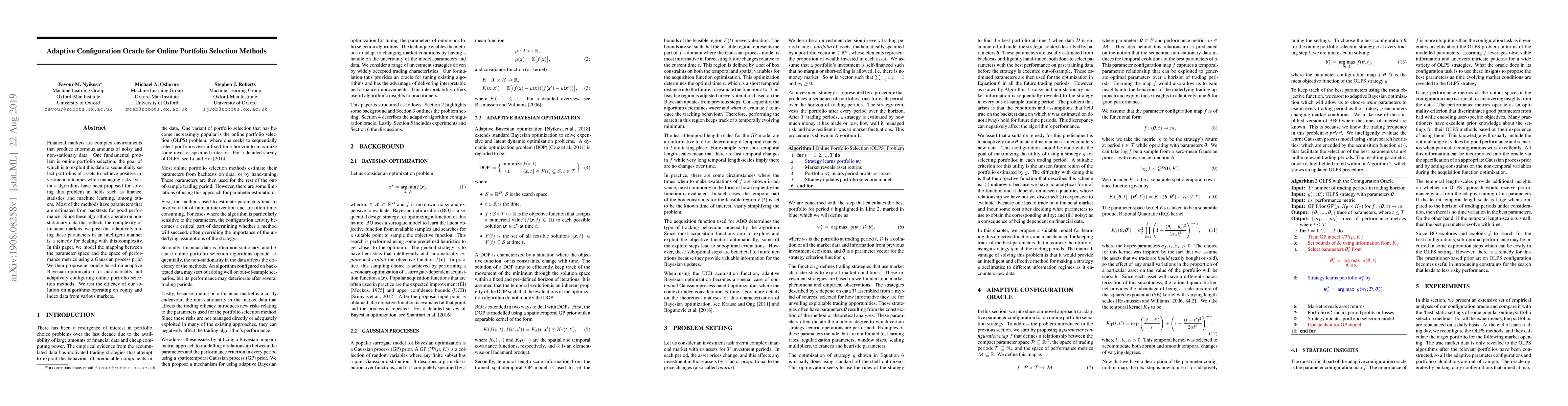This paper proposes an adaptive configuration oracle using adaptive Bayesian optimization and Gaussian process priors to intelligently tune parameters for online portfolio selection methods, aiming to improve performance in the complex, non-stationary environment of financial markets. The effectiveness of the approach is demonstrated through testing on equity and index data from various markets.
