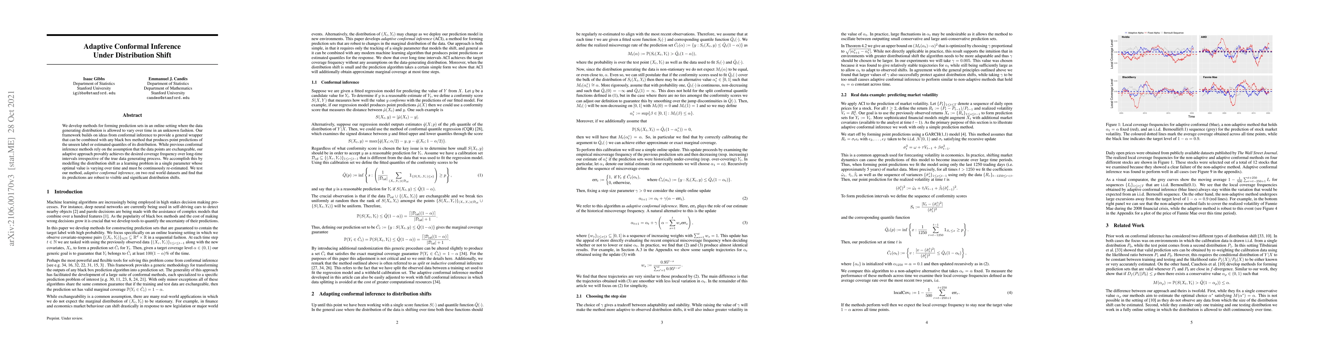 This paper introduces adaptive conformal inference methods for forming prediction sets in online settings with unknown, time-varying data distributions. The proposed framework combines conformal inference with black box prediction methods to achieve desired coverage frequency, demonstrating robustness to significant distribution shifts in real-world datasets.
