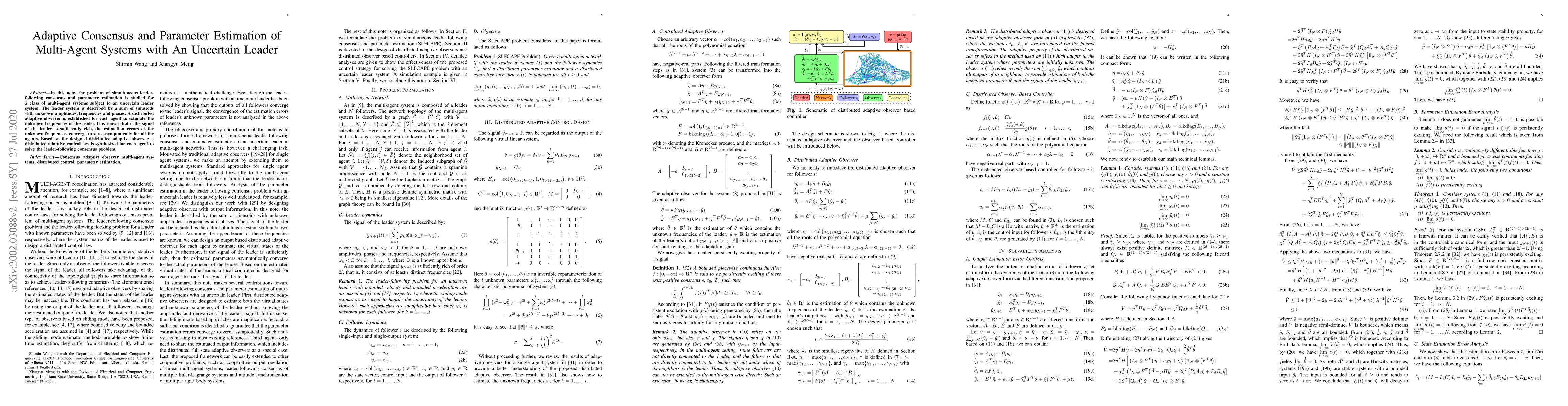 This paper addresses the adaptive consensus and parameter estimation for multi-agent systems with an uncertain leader, modeled as a sum of unknown sinusoids. It proposes a distributed adaptive observer for each agent to estimate the leader's unknown frequencies, ensuring asymptotic convergence of the estimation errors, and a corresponding adaptive control law to achieve leader-following consensus.