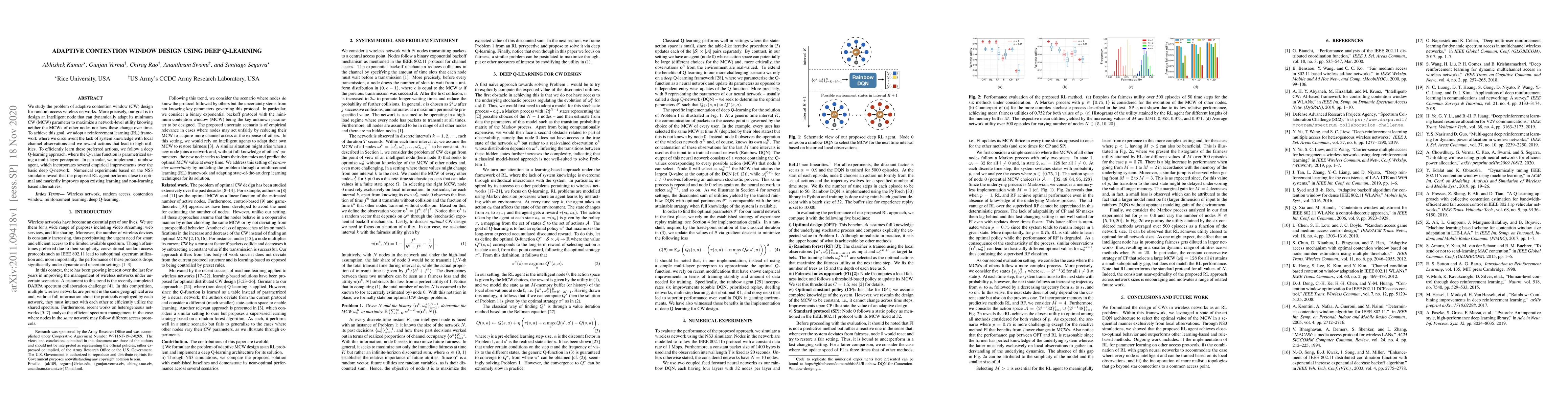 This paper proposes a deep Q-learning approach for adaptive contention window design in random-access wireless networks, enabling nodes to dynamically adjust their minimum CW parameters without prior knowledge of others' settings. The implemented rainbow agent significantly outperforms existing methods, as shown through NS3 simulator experiments.