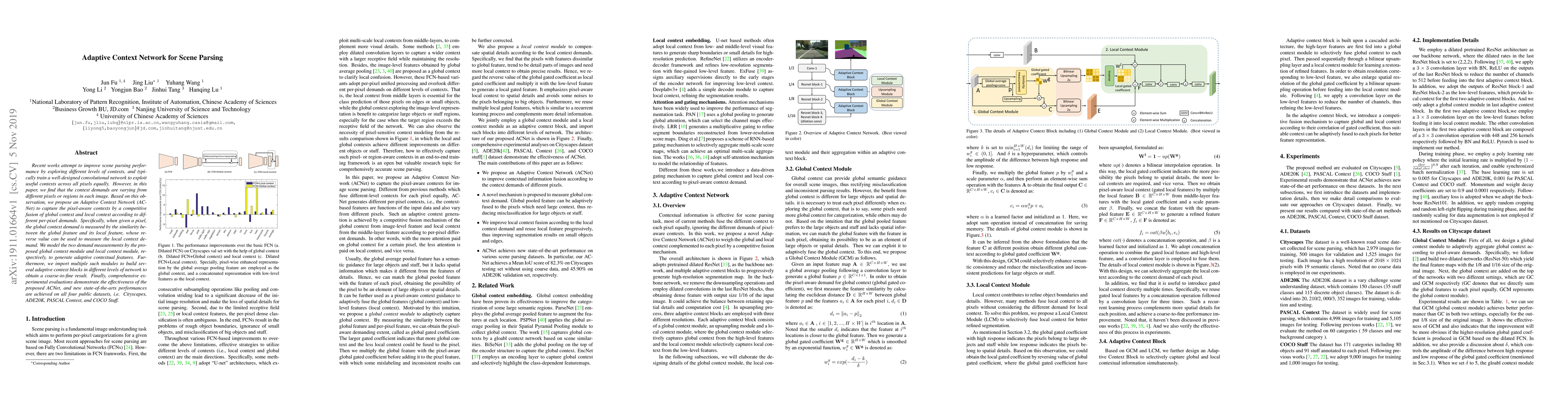 This research introduces the Adaptive Context Network (ACNet) for scene parsing, which adapts context utilization based on varying pixel demands. ACNet competitively fuses global and local contexts, generating adaptive contextual features through global and local context modules. It outperforms existing methods on multiple datasets, setting new state-of-the-art results in Cityscapes, ADE20K, PASCAL Context, and COCO Stuff.