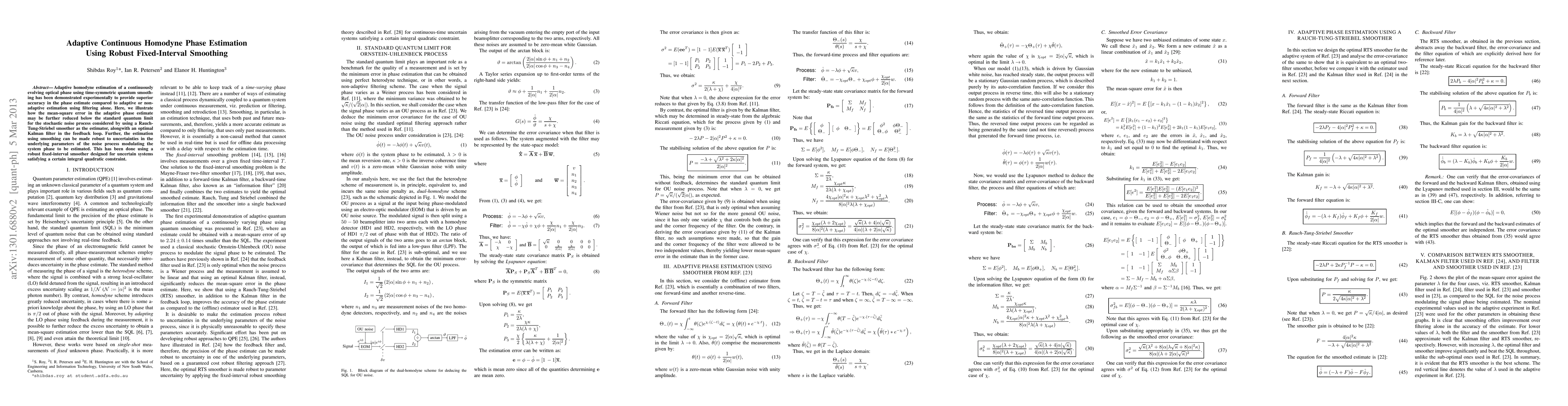 Adaptive homodyne estimation of a continuously evolving optical phase using time-symmetric quantum smoothing has been demonstrated experimentally to provide superior accuracy in the phase estimate compared to adaptive or nonadaptive estimation using filtering alone. Here, we illustrate how the mean-square error in the adaptive phase estimate may be further reduced below the standard quantum limit for the stochastic noise process considered by using a Rauch-Tung-Striebel smoother as the estimator, alongwith an optimal Kalman filter in the feedback loop. Further, the estimation using smoothing can be made robust to uncertainties in the underlying parameters of the noise process modulating the system phase to be estimated. This has been done using a robust fixed-interval smoother designed for uncertain systems satisfying a certain integral quadratic constraint.
