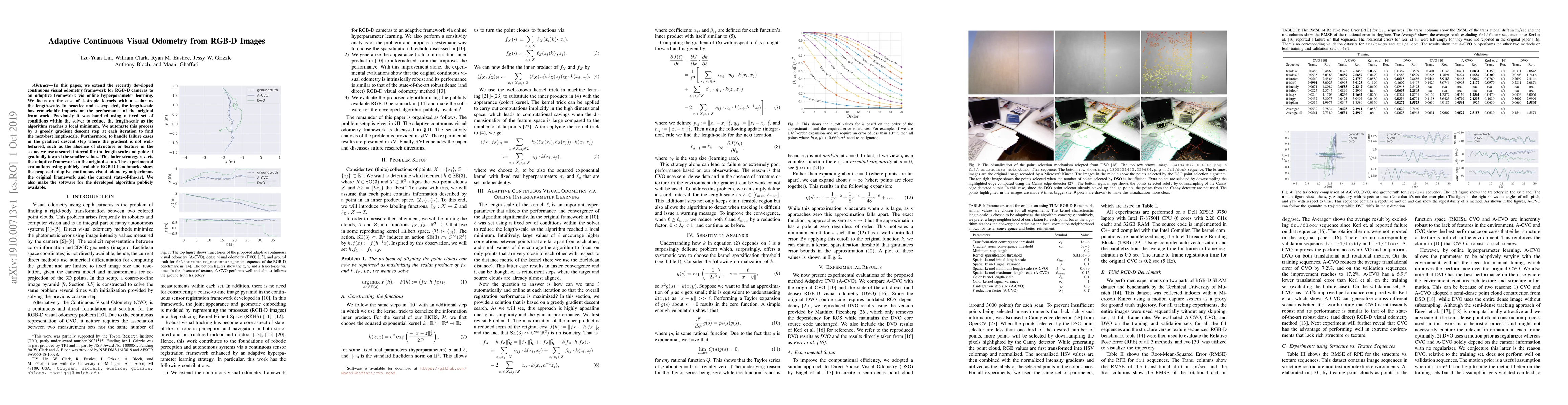 The paper extends the continuous visual odometry framework for RGB-D cameras to an adaptive framework via online hyperparameter learning, focusing on isotropic kernels with a scalar length-scale. It automates the length-scale reduction process using a greedy gradient descent step at each iteration and handles failure cases with a search interval for the length-scale.