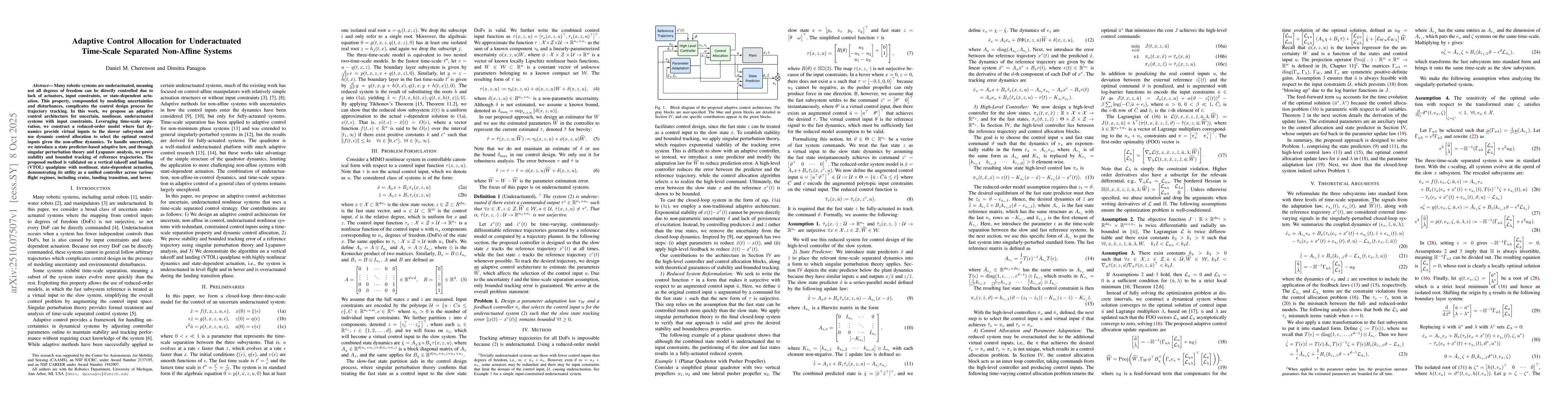 A novel adaptive control framework that combines time-scale separation with dynamic control allocation, providing stability guarantees and bounded tracking error for uncertain underactuated nonlinear systems.