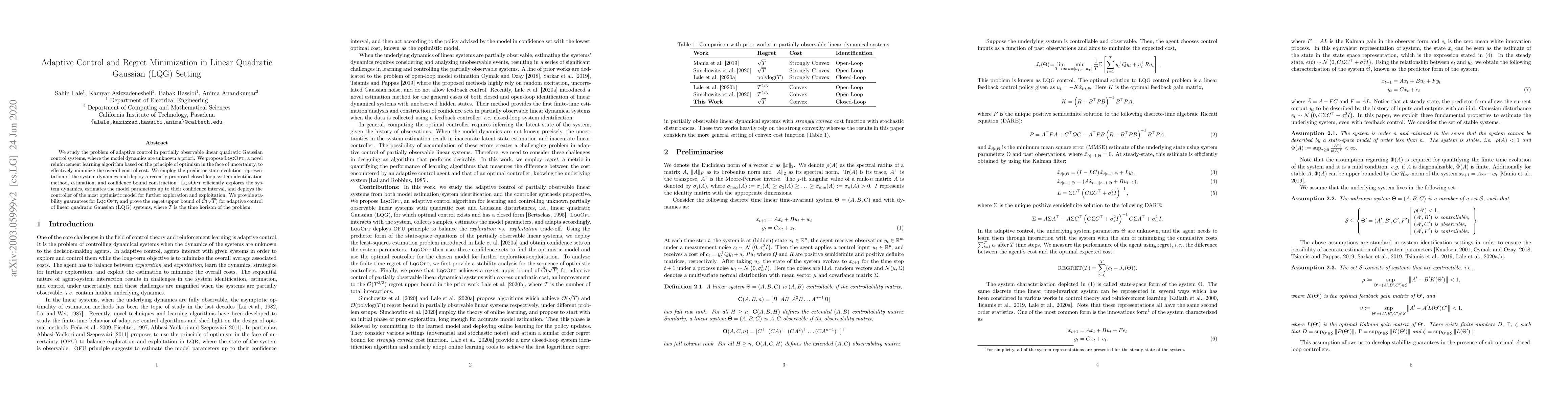 This paper proposes LqgOpt, a reinforcement learning algorithm for adaptive control in partially observable linear quadratic Gaussian systems. It minimizes control cost through optimism and system identification, providing stability guarantees and a regret upper bound of $\tilde{\mathcal{O}}(\sqrt{T})$.
