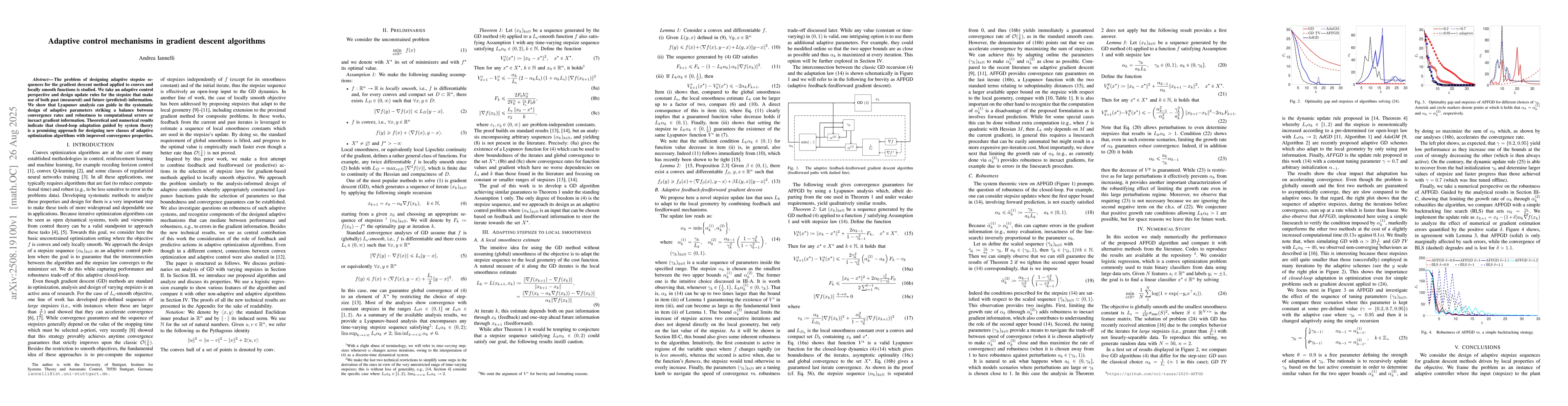 The problem of designing adaptive stepsize sequences for the gradient descent method applied to convex and locally smooth functions is studied. We take an adaptive control perspective and design update rules for the stepsize that make use of both past (measured) and future (predicted) information. We show that Lyapunov analysis can guide in the systematic design of adaptive parameters striking a balance between convergence rates and robustness to computational errors or inexact gradient information. Theoretical and numerical results indicate that closed-loop adaptation guided by system theory is a promising approach for designing new classes of adaptive optimization algorithms with improved convergence properties.
