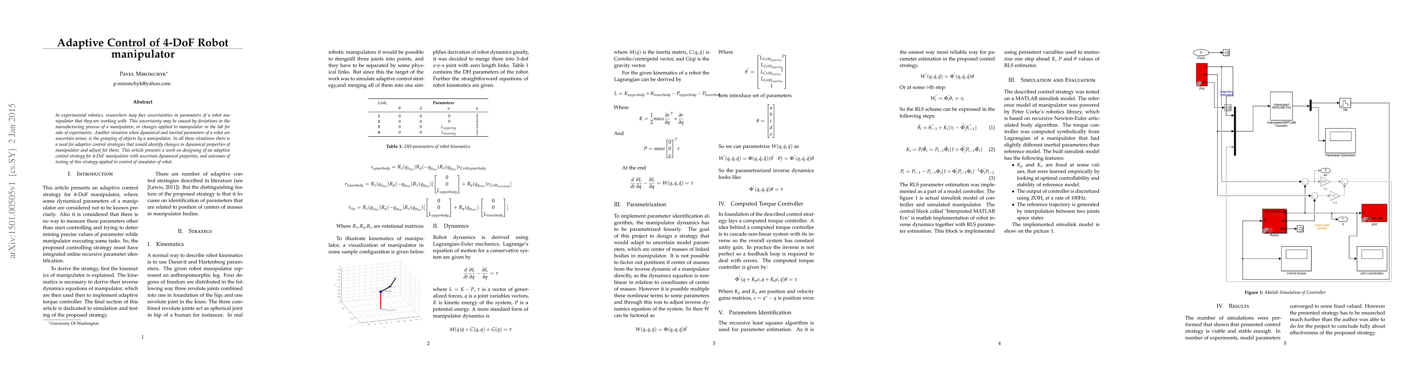 In experimental robotics, researchers may face uncertainties in parameters of a robot manipulator that they are working with. This uncertainty may be caused by deviations in the manufacturing process of a manipulator, or changes applied to manipulator in the lab for sake of experiments. Another situation when dynamical and inertial parameters of a robot are uncertain arises, is the grasping of objects by a manipulator. In all these situations there is a need for adaptive control strategies that would identify changes in dynamical properties of manipulator and adjust for them. This article presents a work on designing of an adaptive control strategy for 4-DoF manipulator with uncertain dynamical properties, and outcomes of testing of this strategy applied to control of simulator of robot.