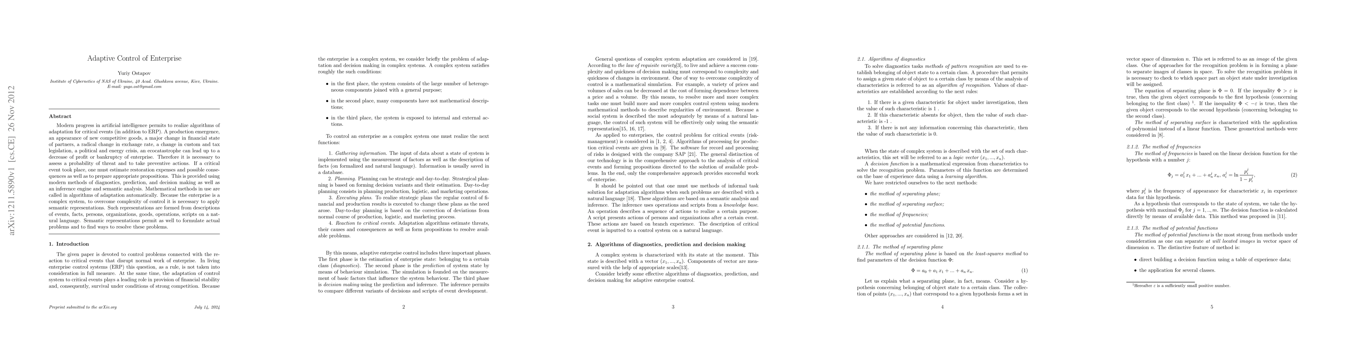 Modern progress in artificial intelligence permits to realize algorithms of adaptation for critical events (in addition to ERP). A production emergence, an appearance of new competitive goods, a major change in financial state of partners, a radical change in exchange rate, a change in custom and tax legislation, a political and energy crisis, an ecocatastrophe can lead up to a decrease of profit or bankruptcy of enterprise. Therefore it is necessary to assess a probability of threat and to take preventive actions. If a critical event took place, one must estimate restoration expenses and possible consequences as well as to prepare appropriate propositions. This is provided using modern methods of diagnostics, prediction, and decision making as well as an inference engine and semantic analysis. Mathematical methods in use are called in algorithms of adaptation automatically. Because the enterprise is a complex system, to overcome complexity of control it is necessary to apply semantic representations. Such representations are formed from descriptions of events, facts, persons, organizations, goods, operations, scripts on a natural language. Semantic representations permit as well to formulate actual problems and to find ways to resolve these problems.