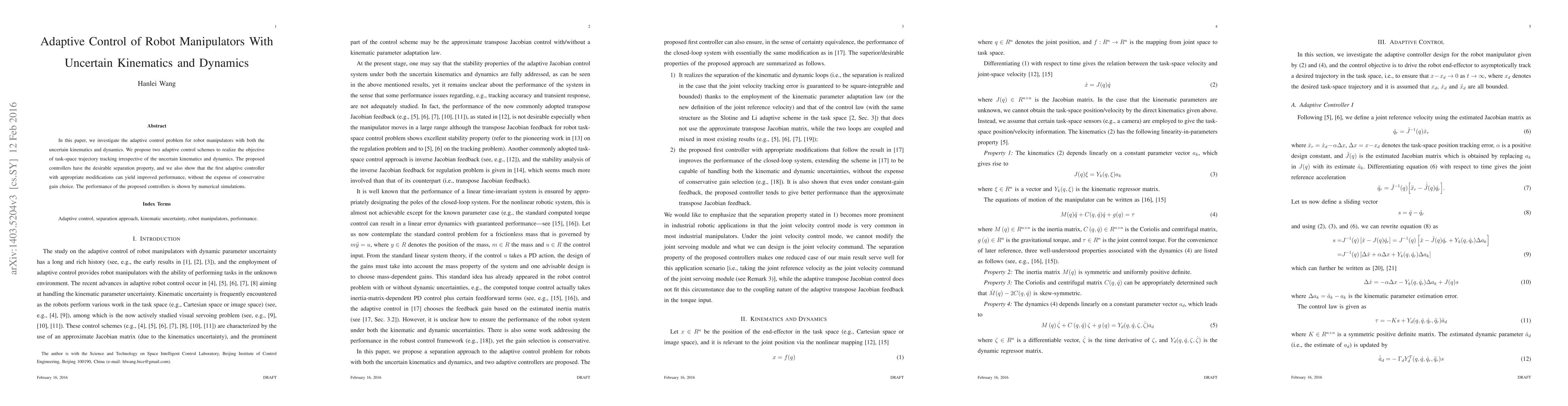 This paper proposes adaptive control schemes for robot manipulators with uncertain kinematics and dynamics, achieving task-space trajectory tracking. The controllers exhibit separation properties and improved performance without conservative gain choices, validated through numerical simulations.