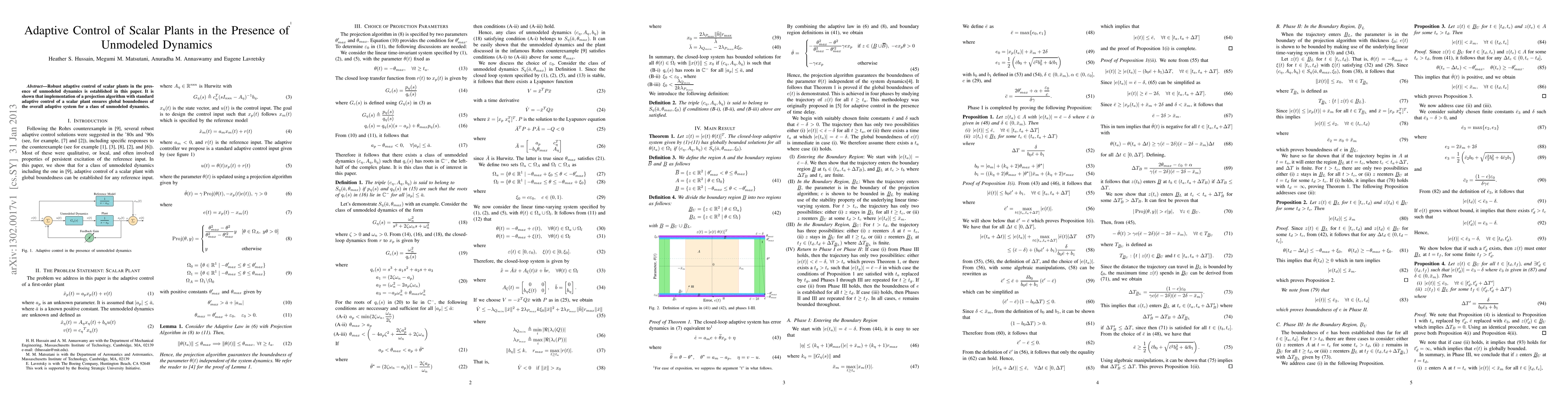 This paper establishes robust adaptive control for scalar plants with unmodeled dynamics, demonstrating that a projection algorithm combined with standard adaptive control ensures global boundedness of the system for a specific class of unmodeled dynamics.