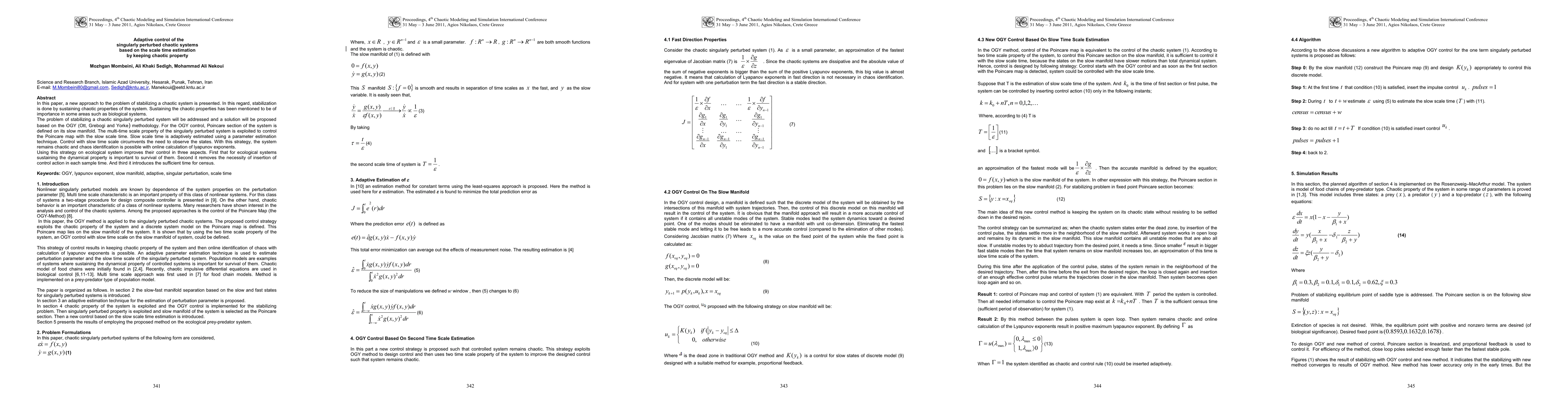 In this paper, a new approach to the problem of stabilizing a chaotic system is presented. In this regard, stabilization is done by sustaining chaotic properties of the system. Sustaining the chaotic properties has been mentioned to be of importance in some areas such as biological systems. The problem of stabilizing a chaotic singularly perturbed system will be addressed and a solution will be proposed based on the OGY (Ott, Grebogi and Yorke) methodology. For the OGY control, Poincare section of the system is defined on its slow manifold. The multi-time scale property of the singularly perturbed system is exploited to control the Poincare map with the slow scale time. Slow scale time is adaptively estimated using a parameter estimation technique. Control with slow time scale circumvents the need to observe the states. With this strategy, the system remains chaotic and chaos identification is possible with online calculation of lyapunov exponents. Using this strategy on ecological system improves their control in three aspects. First that for ecological systems sustaining the dynamical property is important to survival of them. Second it removes the necessity of insertion of control action in each sample time. And third it introduces the sufficient time for census.